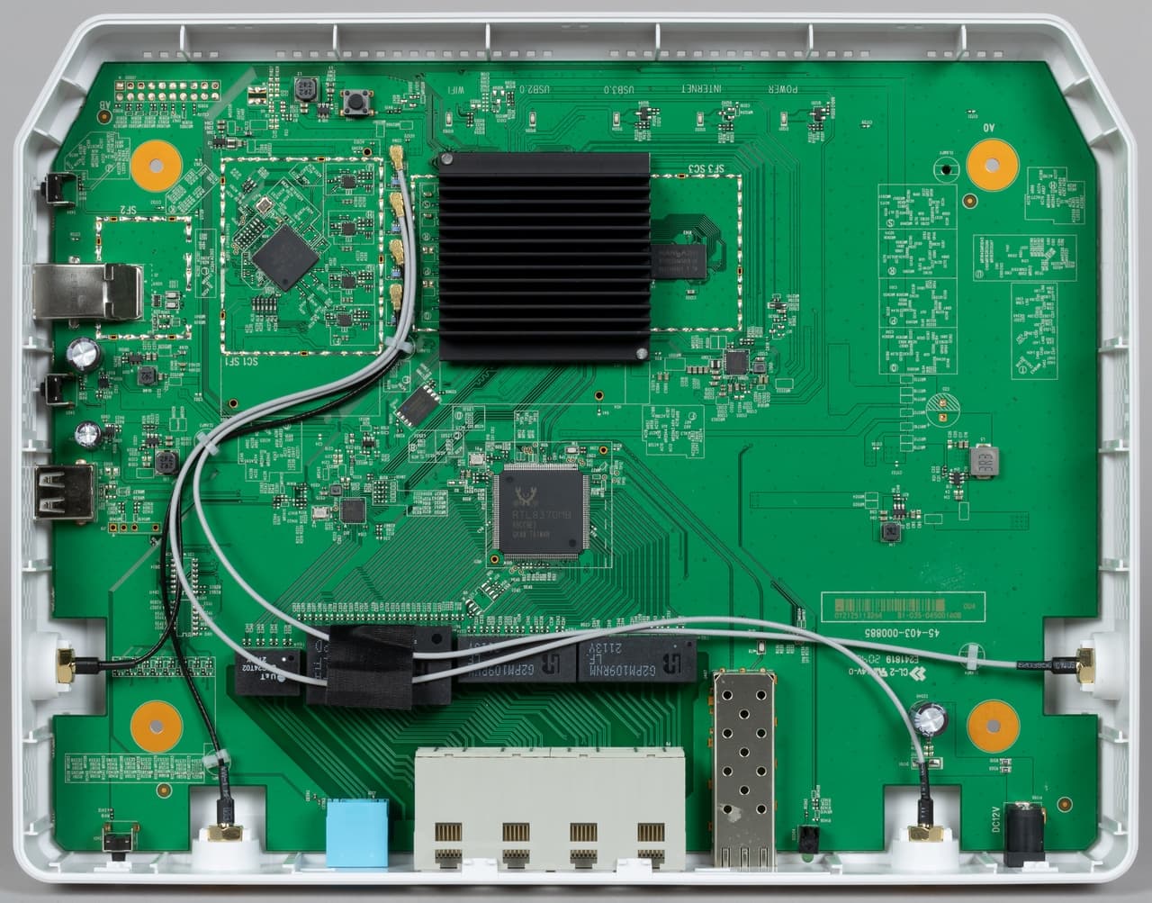 Печатная плата роутера выполнена аккуратно. При этом мы видим только относительно небольшой радиатор на основном процессоре. Все остальные микросхемы, включая внешний радиоблок, обходятся без них. Интересно будет посмотреть на фактическое энергопотребление в разных режимах. Удобных средств контроля температуры здесь нет, но можно через консоль прочитать данные с радиоблоков. Обратим внимание и на то, что порт USB 3.0 имеет дополнительное экранирование для снижения влияния на другие подсистемы продукта.