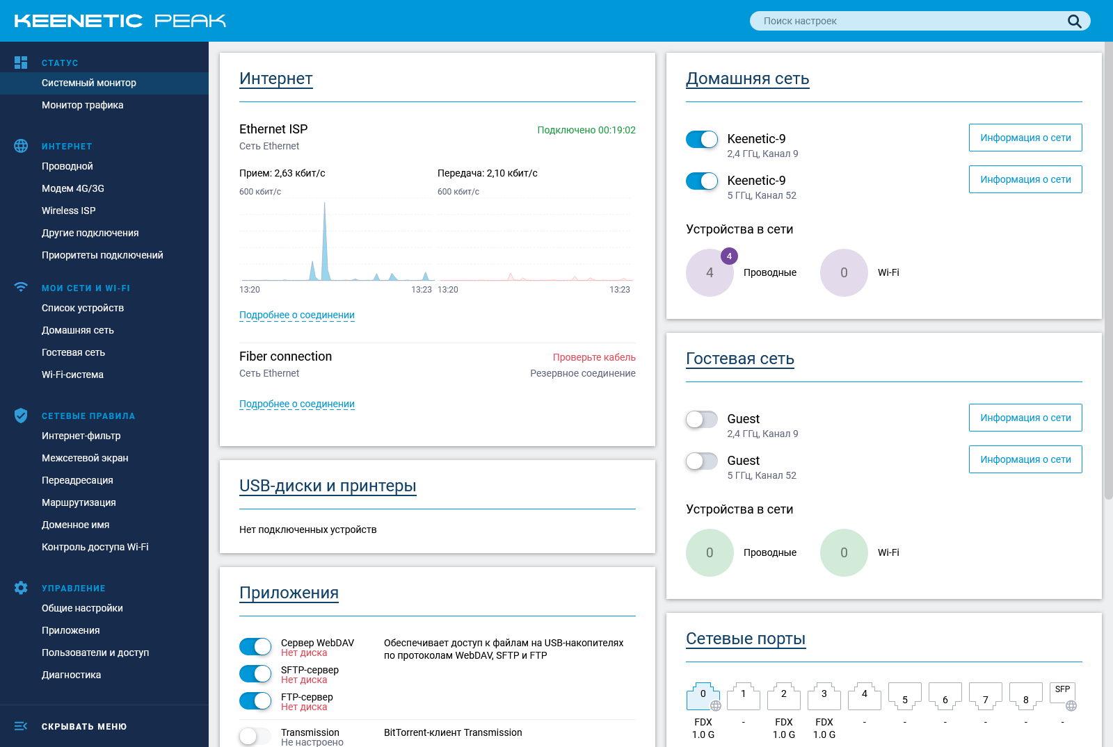 Учитывая большой объем оперативной и флеш-памяти, никаких ограничений по использованию многочисленных дополнительных программных пакетов в Keenetic Peak KN-2710 нет. Поддержка внешних устройств, включая накопители, модемы, фирменные адаптеры для DSL и телефонии, также на месте. Конечно, реализованы и все онлайн-сервисы, включая доменные имена, SSL-сертификаты, облачный доступ, мобильное приложение и так далее.
