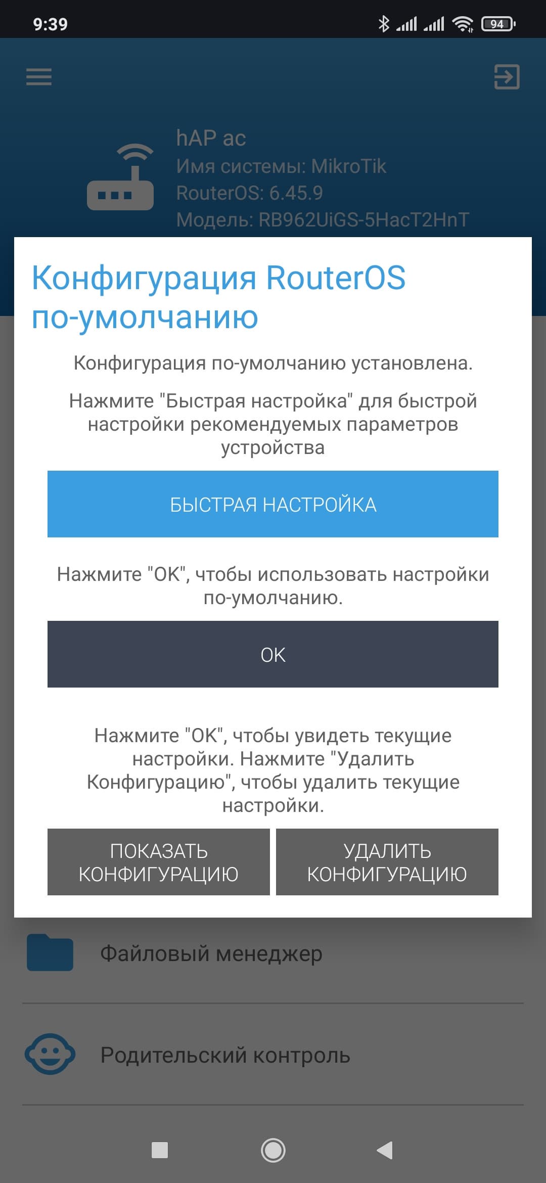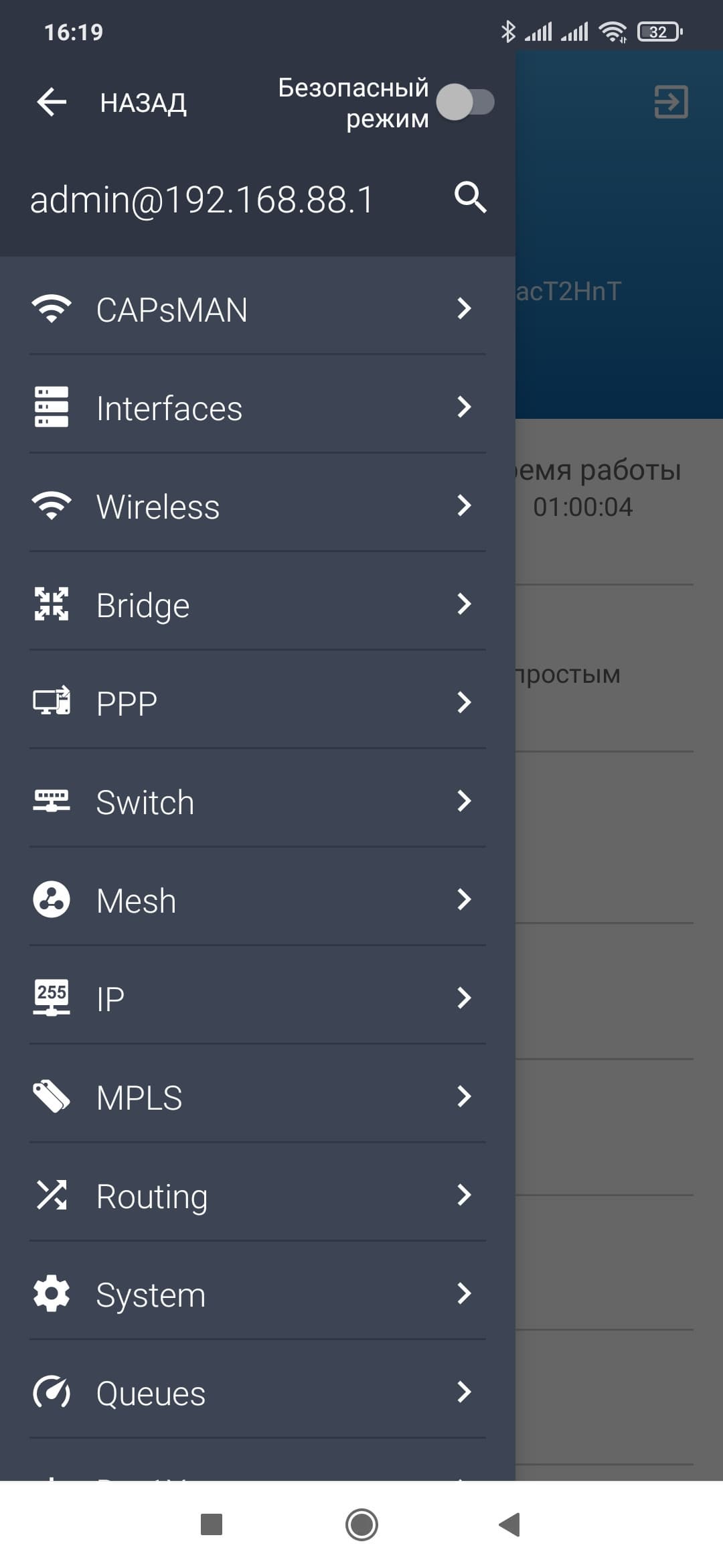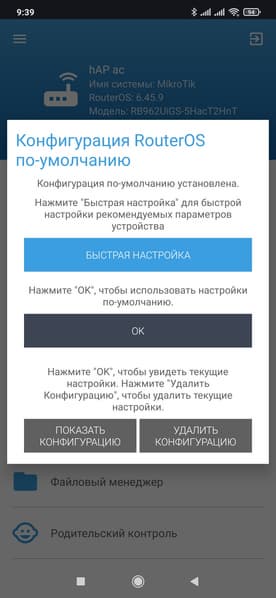 Как мы писали выше, в данной статье мы не будем детально углубляться в описание RouterOS, поскольку тема это в определенном смысле бескрайная. Так что о настройках будет сказано буквально несколько слов. Устройство поддерживает несколько вариантов доступа к конфигурации — через браузер, через фирменные программы для Windows и мобильных ОС, а также по telnet и ssh. Для разнообразия в этот раз мы начали с мобильного приложения.