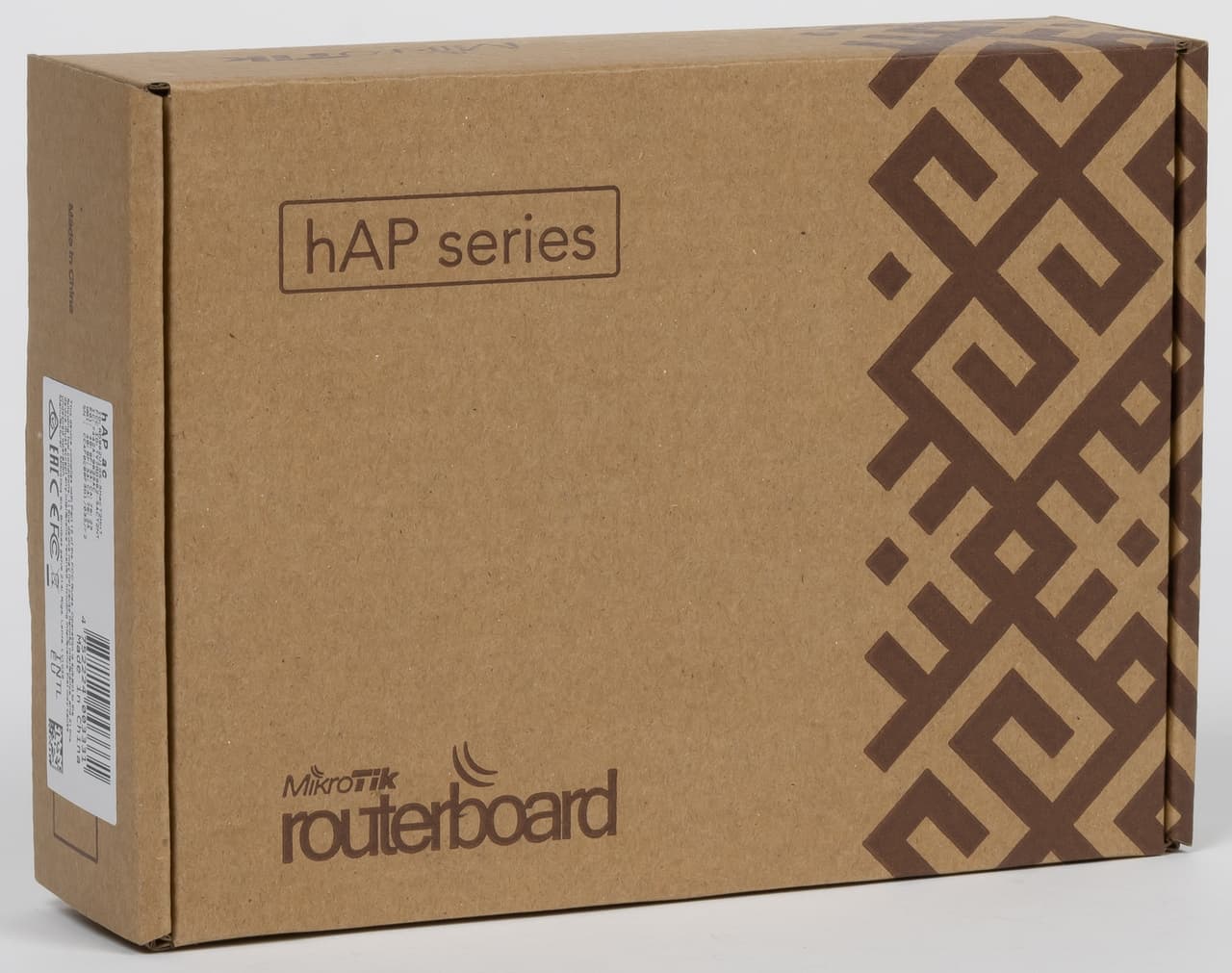 Поставляется роутер в скромной картонной коробке небольших размеров. Из полезного на ней только наклейка с артикулом, MAC-адресами и серийным номером. Небольшие габариты обусловлены использованием встроенных антенн в роутере.