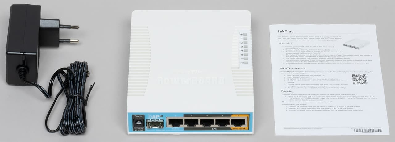 Около года назад мы протестировали беспроводной роутер Mikrotik hAP ac², материал получился достаточно популярным и вызвал большое (для данного раздела сайта) обсуждение. При установке фильтра на «беспроводное оборудование для дома и офиса» в каталоге продуктов компании на момент подготовки этой статьи отображались почти три десятка продуктов, из которых пять моделей серии hAP могут считаться подходящими на роль современного домашнего беспроводного роутера. При этом не вникая во все тонкости продуктов, может быть сложно разобраться, «какой круче». Например, в этой статье мы познакомимся с устройством hAP ac. Оно имеет в два раза более высокую стоимость (в официальном магазине компании), чем hAP ac², более производительные точки доступа, но при этом одноядерный процессор с архитектурой MIPS против четырех ядер ARM у второй версии. Другие отличия (порт SFP и выход PoE) относятся скорее к узкоспециализированным параметрам, которые обычно выбираются по принципу «должно присутствовать», а не «пусть будет, может пригодится». Кстати, компания недавно представила модель hAP ac³, которая по стоимости и возможностям попала между первой и второй версиями. Заодно напомним, что кроме простого названия моделей, производитель использует и сложные артикулы. Для hAP ac он выглядит так: RB962UiGS-5HacT2HnT.