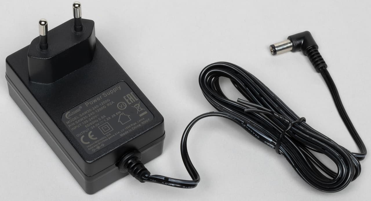Блок питания имеет параметры 24 В 1,2 А (28,8 Вт), кабель 2,1 м и обычный круглый угловой штекер. Корпус рассчитан на установку в розетку и достаточно компактный, но в некоторых случаях все-таки может блокировать соседние розетки в удлинителе. Заметим, что по факту роутер можно питать от источника постоянного тока 10—57 В через обычный вход или через PoE на первом порту RJ45.