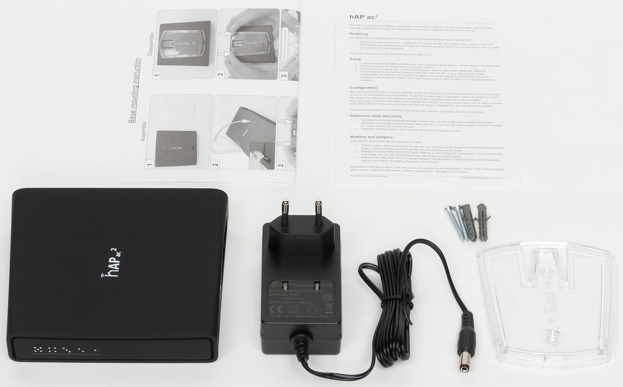 В комплекте идет сам роутер, блок питания к нему, прозрачная подставка, выполняющая также роль крепления на стену, два шурупа с дюбелями и пара листовок.