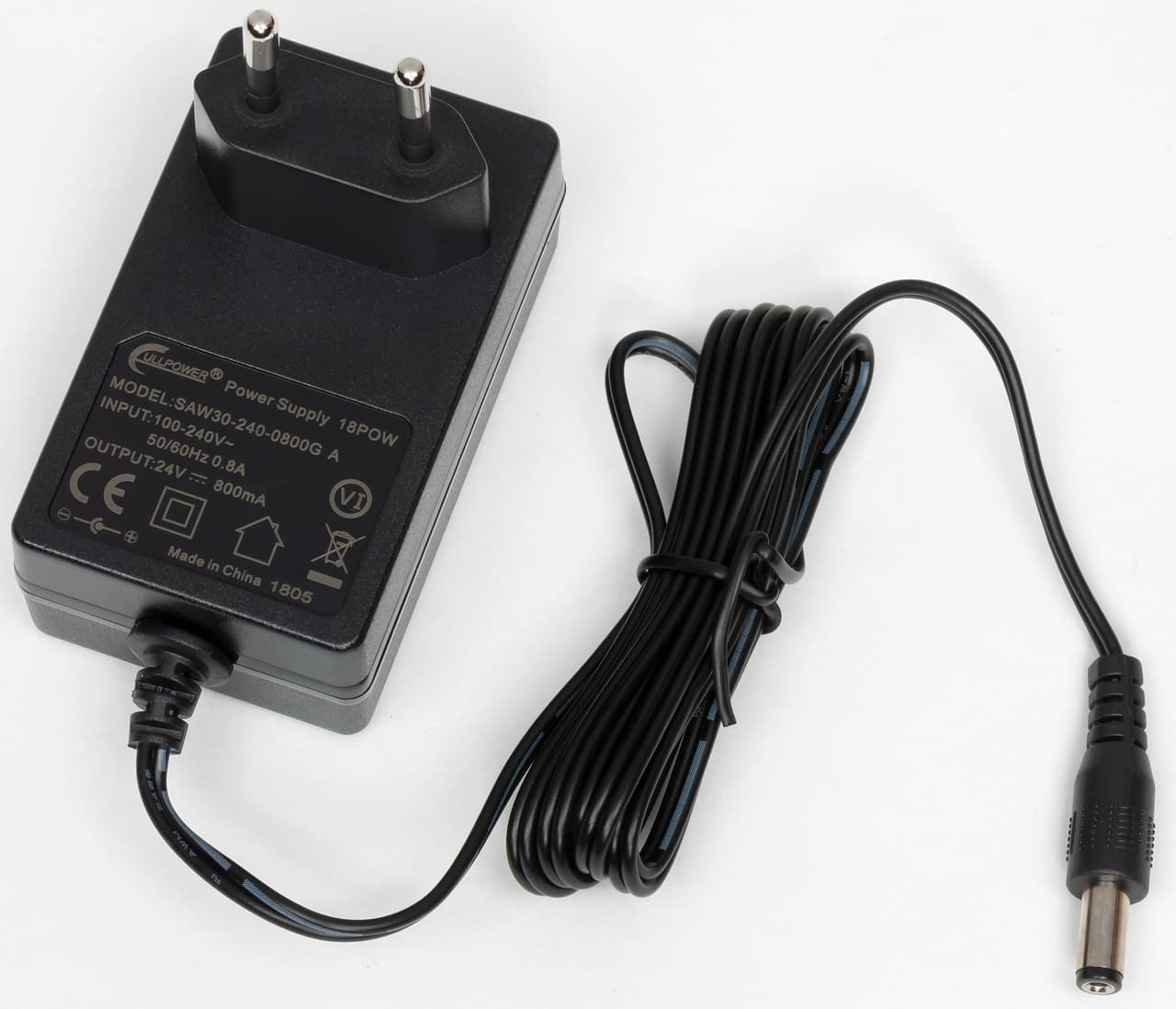 Блок питания относительно крупный и в некоторых случаях может блокировать соседние розетки. Его параметры — 24 В 800 мА. Кабель имеет длину 1,5 м и стандартный круглый разъем 5,5/2 мм.