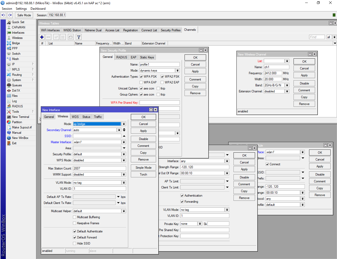 Беспроводные точки доступа поддерживают создание нескольких SSID на каждом физическом интерфейсе, различные профили защиты, правила доступа. Предусмотрено использование дополнительных режимов для организации мостов, подключения к интернету по Wi-Fi, сервиса HotSpot и других. Есть встроенные функции сканирования эфира и определения нагрузки на каналы. Последние, кстати, указываются здесь не традиционным номером, а частотой, что несколько непривычно.