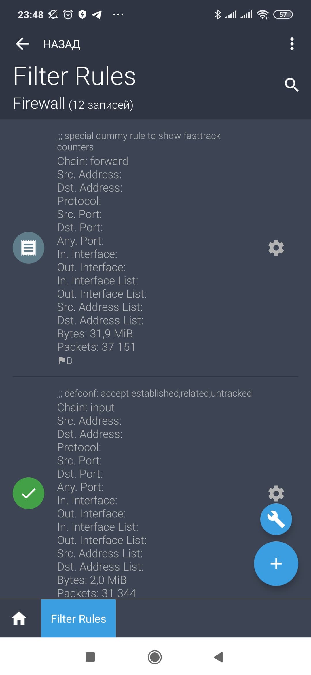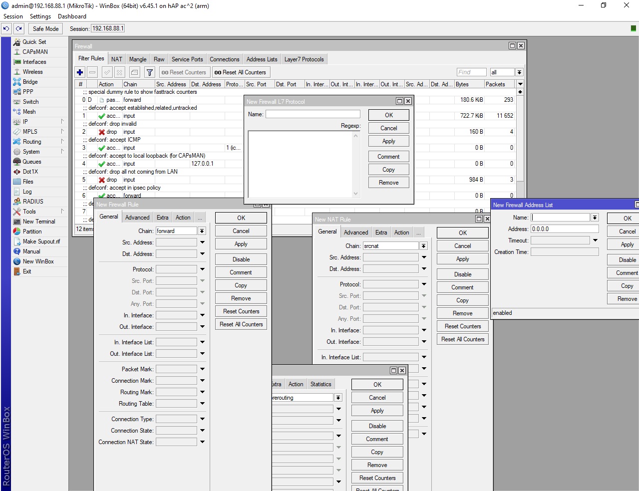 Про раздел IP/Firewall можно было бы рассказывать месяцами. Ссылку на схему обработки трафика мы приводили выше. Кроме стандартных функций открытия портов, здесь предусмотрены многочисленные правила, которые совместно с другими настройками позволяют повышать уровень защиты, ограничивать скорость, определенным образом помечать трафик и так далее.