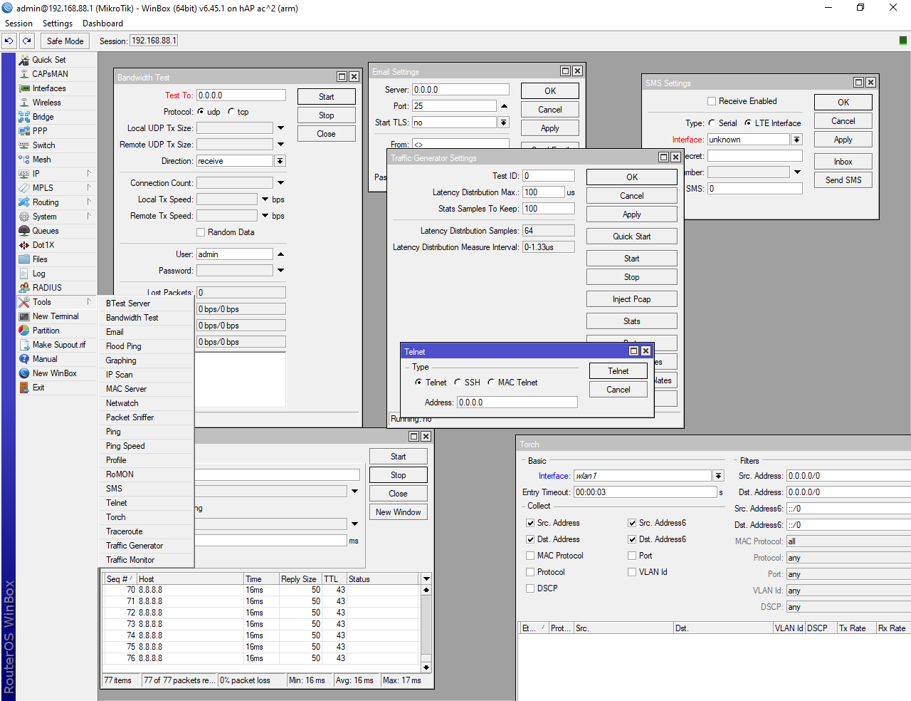 Группа «Tools» содержит множество полезных сервисов и утилит для диагностики и мониторинга сети. Здесь можно узнать, какой клиент и чем забивает канал, просканировать IP-адреса, проверить скорость сети и даже отправить email или SMS (конечно, при наличии поддерживаемого модема).