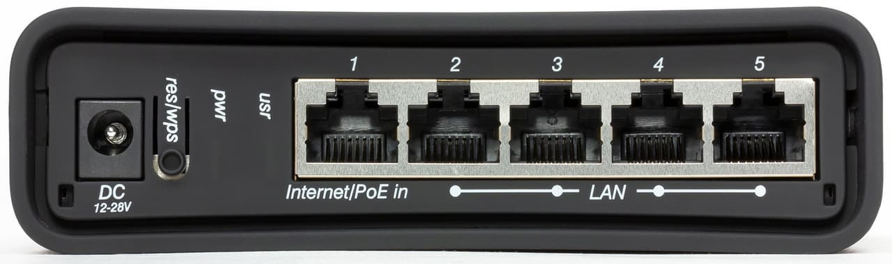 Кроме стандартного варианта питания через сетевой адаптер (причем здесь может быть не только штатные 24 В постоянного тока, но и любой вариант между 12 и 28 В), роутер может работать и от Passive PoE (не 802.3af/at), который нужно подключить в первый порт.