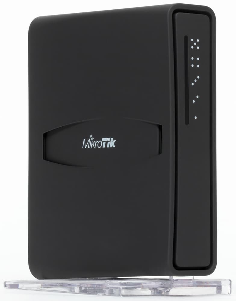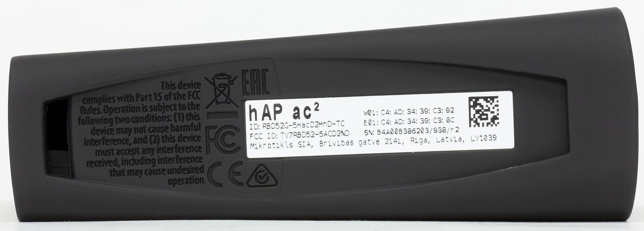 Если вы привыкли выбирать себе гаджеты по внешнему виду, то Mikrotik hAP ac² вероятно вас не впечатлит — однотонный корпус из темного матового пластика с «бархатным» покрытием. Габаритные размеры 120×97×33 мм, вес — около 170 г (без подставки).