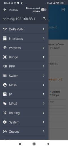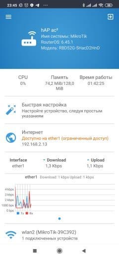 Кроме описанных вариантов доступа предлагается также и фирменное мобильное приложение. В нем представлены аналогичные Winbox разделы, хотя, конечно, на экране мобильного устройства работать существенно менее удобно, чем на компьютере, если только вы не выучите командную строку. Впрочем, компания попробовала реализовать и более «бытовые» функции в упрощенном формате, но не все получилось удобным.