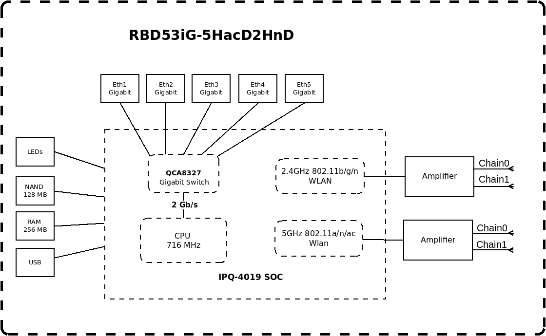 Как мы говорили выше — аппаратных отличий от предшественника немного. Основной процессор — четырехъядерный ARM Qualcomm IPQ4019. Штатная частота работы 716 МГц может быть изменена пользователем в настройках. Объем оперативной памяти вырос в два раза — до 256 МБ, а флеш-памяти — сразу в восемь раз — до 128 МБ (кроме того, теперь используется чип NAND). Производитель на своем сайте предоставляет и блок-схему модели.