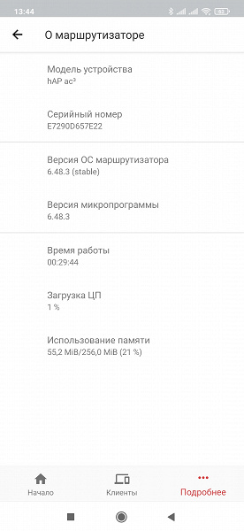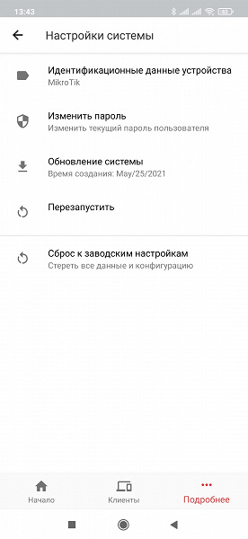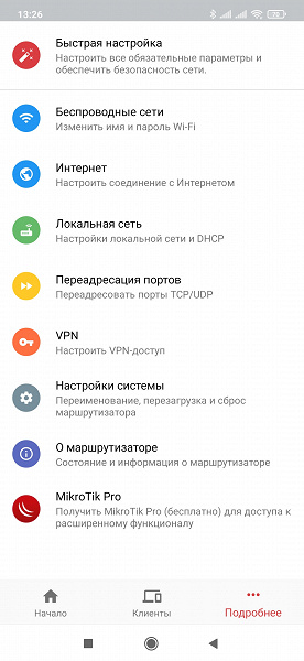 Собственно настройки собраны в меню, которое открывается в разделе «Подробнее». В отличие от полного меню в программе MikroTik Pro, здесь пунктов существенно меньше. Первым идет повторный запуск мастера настройки.