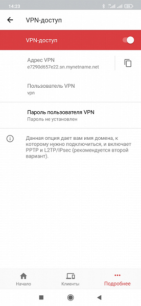 Далее идет пункт для быстрой настройки внешнего доступа через VPN (требует «белого» адреса от провайдера, использует фирменный сервис DDNS). При этом имя пользователя фиксировано, а пароль можно изменить. Оценка последствий включения опции показала, что включаются сразу три сервера — PPTP, L2TP и SSTP и настраиваются правила Firewall. Но вот конфигурация профиля и пользователя выглядят некорректными.