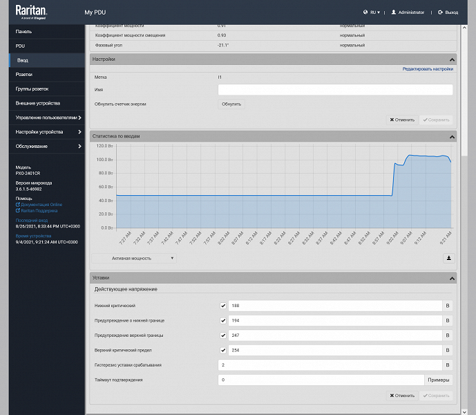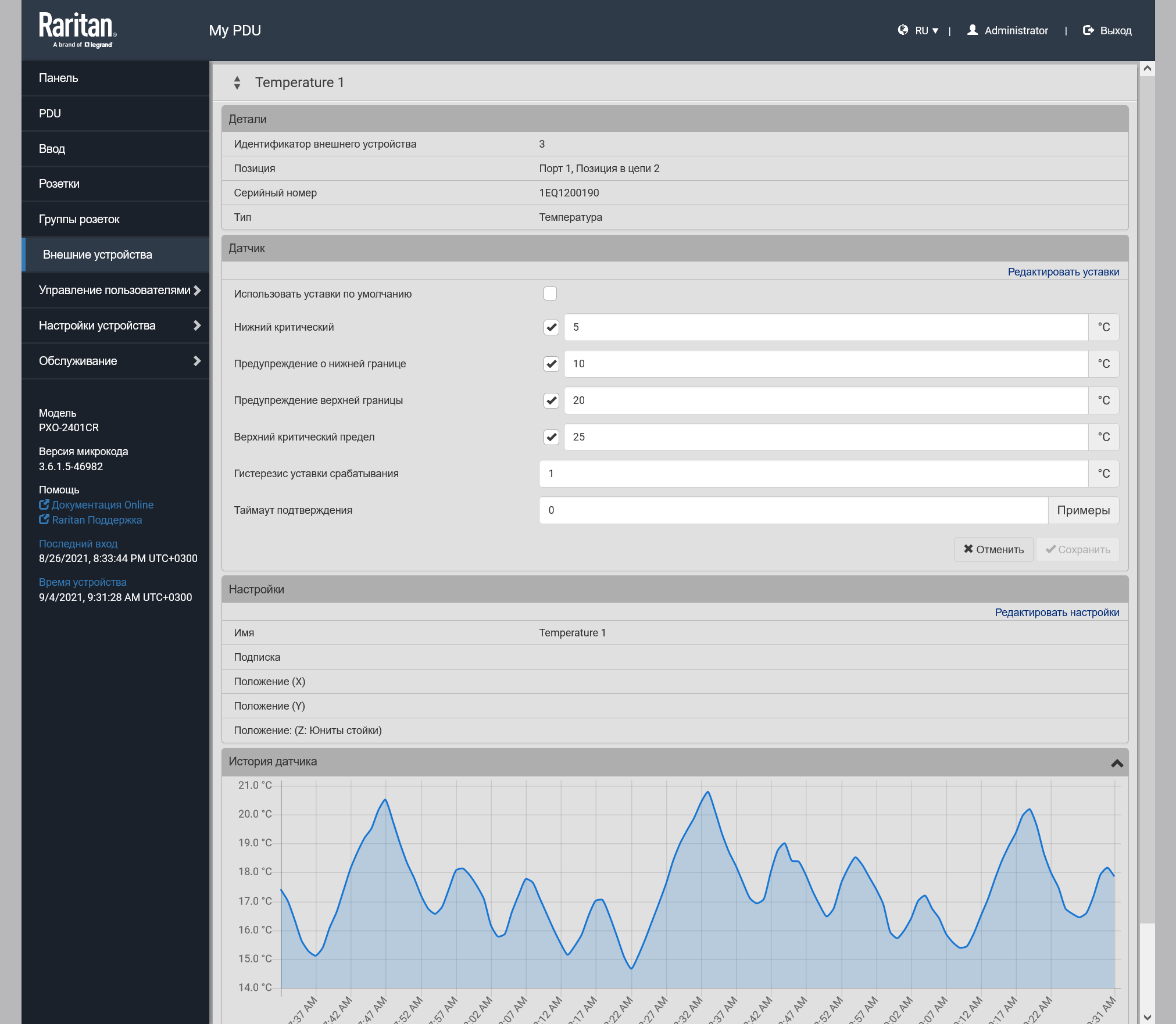На странице PDU, кроме модели и версии прошивки, также есть такая информация как серийный номер и основной MAC-адрес. Несколько неожиданно встретить здесь же кнопку для экспорта данных мониторинга, включая показания внешних датчиков.