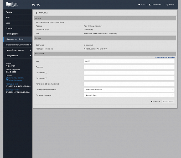 В свойствах датчика есть данные о его типе, позиции в цепочке и серийный номер. Также показывается состояние и время последнего изменения. Пользователь может изменить имя, указать положение в серверной (например, номер стойки и номер юнита). Для бинарного датчика можно выбрать тип подключенного к нему сенсора, а также указать нормальное состояние.