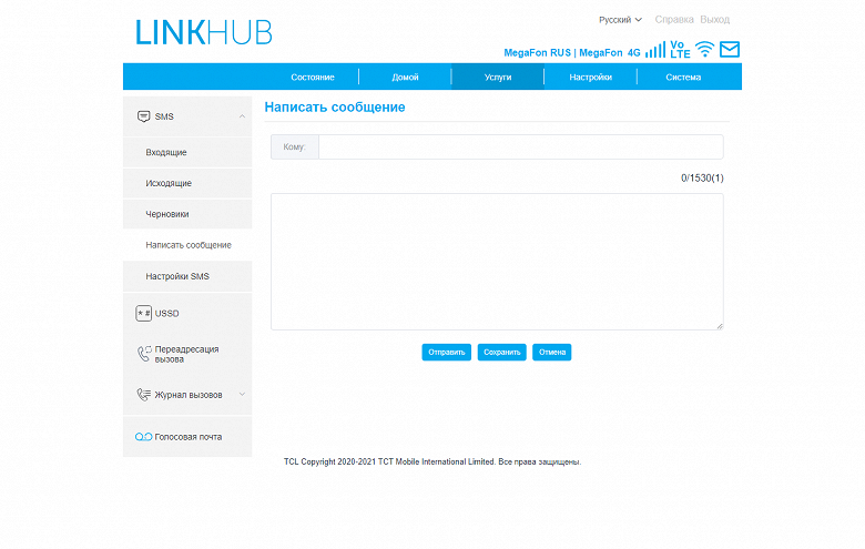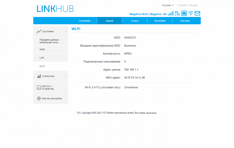 Устройство поддерживает два варианта управления — через традиционный веб-браузер и через фирменное мобильное приложение. Ссылки для загрузки программы указаны на странице входа и на наклейке на корпусе устройства. Посмотрим сначала на первый. Веб-интерфейс представлен на русском языке (можно переключиться и на английский), что упрощает работу с ним. Есть также ссылка на справку (файл PDF на сайте производителя). В верхней части окна справа находится информационный блок с полезными значками — состояние подключения к сотовому оператору, статусы VoLTE, проводного подключения и Wi-Fi, переход к сообщениям SMS.