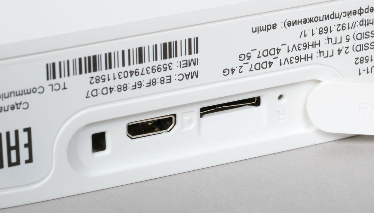 На дне корпуса за пластиковой заглушкой расположены скрытая кнопка сброса, слот для SIM-карты формата Nano-SIM и порт Micro-USB неизвестного назначения. Карта устанавливается в подпружиненный слот — возможно, потребуется какой-то инструмент для выполнения этой операции. Здесь же находится информационная наклейка с названиями беспроводных сетей и паролем доступа к ним.