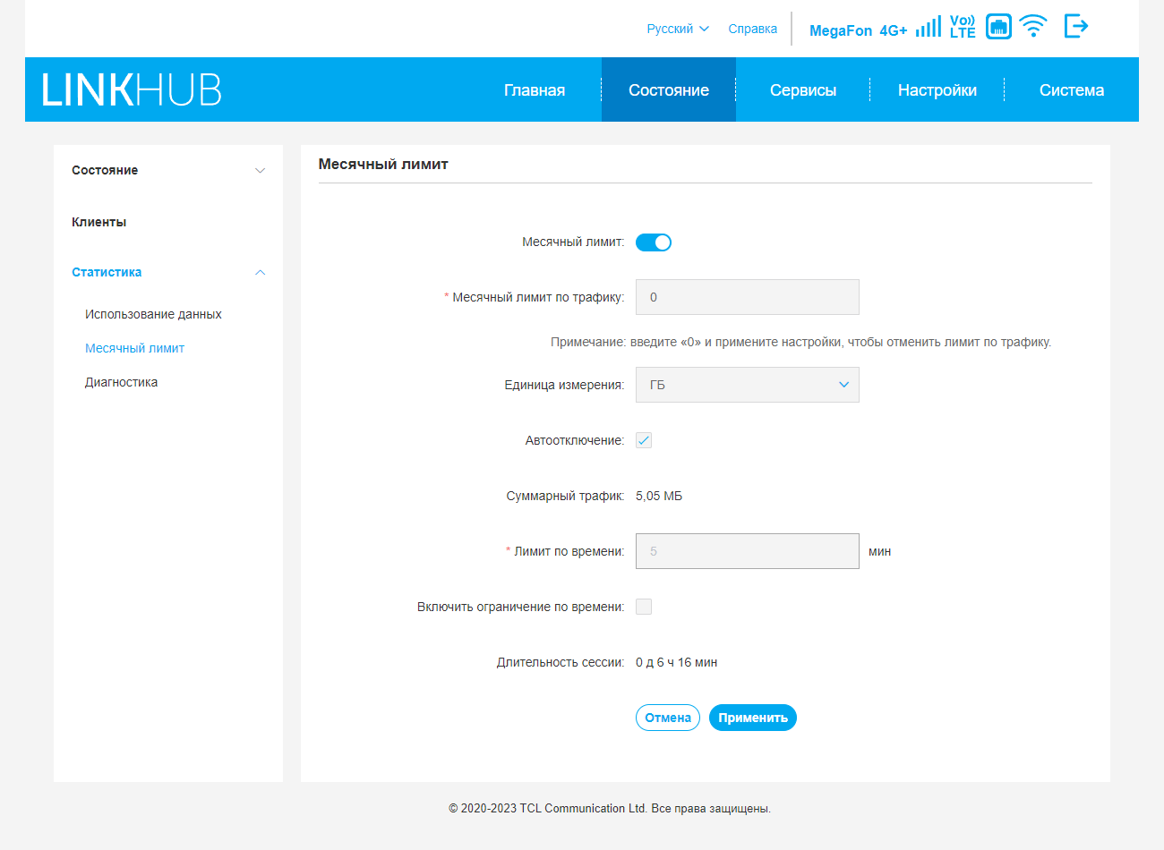 Раздел статистика может быть полезен, если сотовый оператор предоставляет тариф с ограничением трафика. Здесь собраны данные по объемам, можно установить ограничение на месяц или на время работы. Страница «Диагностика» показывает подробные данные о подключении к сотовой сети, включая соту, уровни сигналов, диапазоны и так далее.