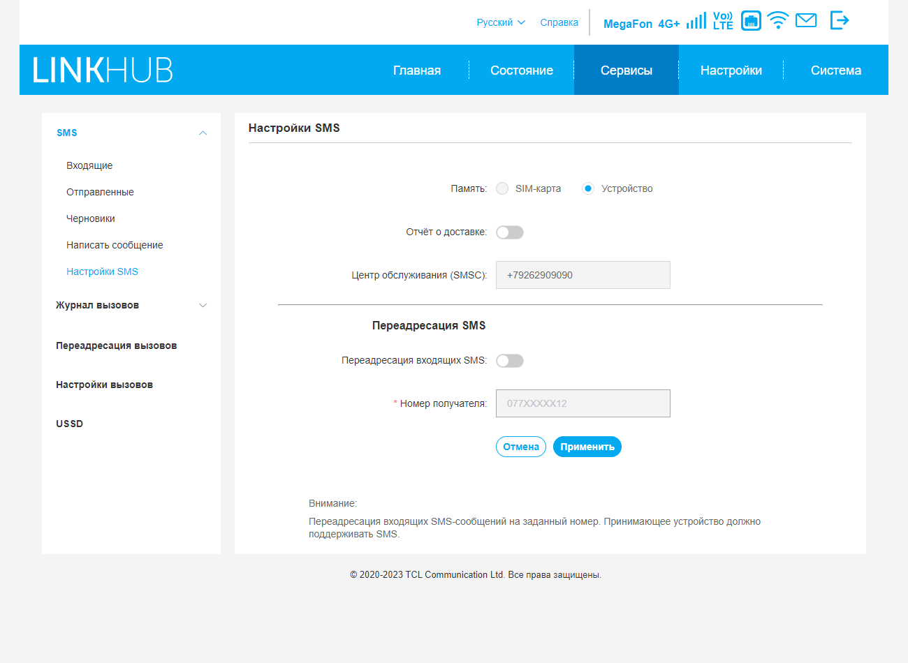 В группе «Сервисы» собраны полезные функции по работе с сотовой сетью. В частности, речь идет о работе с SMS и голосом — доступны прием и передача сообщений, есть журналы вызовов (напомним, что роутер поддерживает работу с голосом через VoLTE). В настройках можно активировать режим переадресации для сообщений и голосовых звонков. Есть в роутере и поддержка работы с командами USSD. Всё это существенно упрощает контроль и управление номером, так что даже не потребуется переустановка карточки в смартфон для проверки баланса или привязки к личному кабинету.