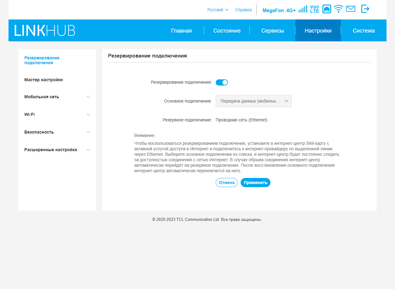 Следующая группа относится уже непосредственно к настройкам самого роутера. На странице «Резервирование подключения» можно включить данный режим и выбрать основное подключение.