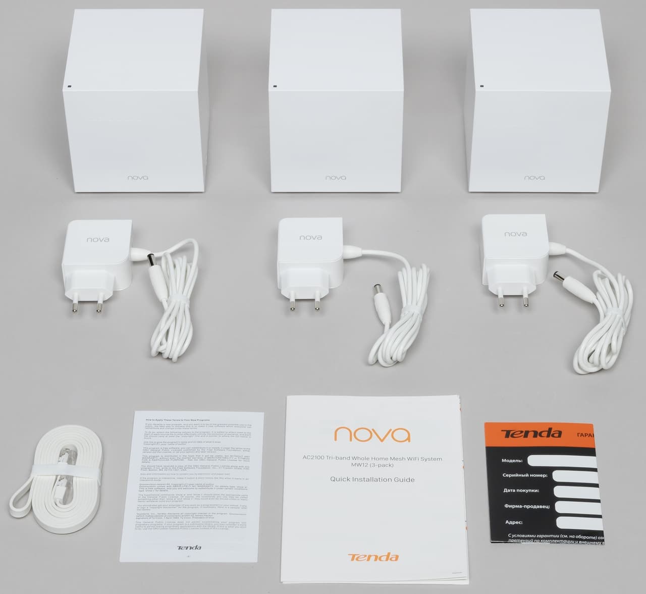 Комплект поставки — три узла-кубика, три блока питания для них, один сетевой патч-корд, инструкция-листовка на нескольких языках, включая русский, по началу работы, гарантийный талон. Блоки питания на 12 В 1,5 А. Имеют белые компактные корпуса. Длина кабеля составляет 180 см. Подключение к узлу — стандартный круглый штекер 5,5 мм. Патч-корд тоже белый, плоский, длина — 150 см.