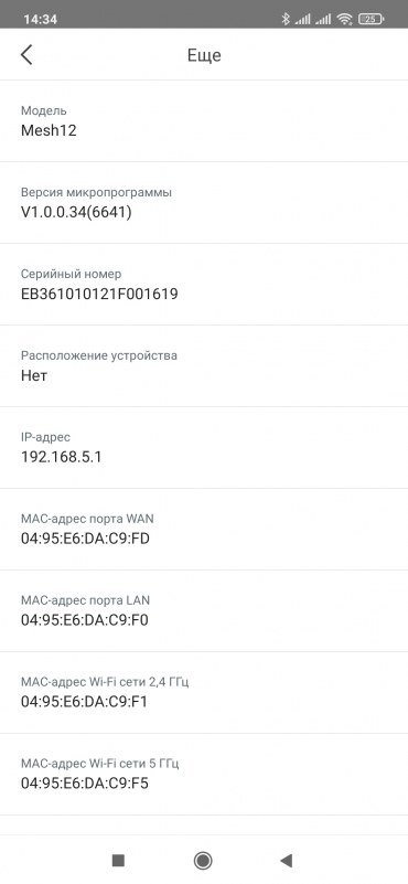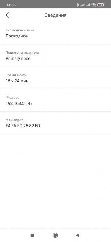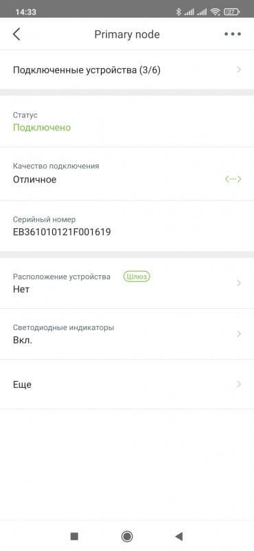 При клике на узле можно посмотреть данные по нему — качество подключения к Mesh-сети, серийный номер, версию прошивки, IP- и MAC-адреса. Опционально можно отключить индикатор и выбрать комнату/помещение, где стоит узел.