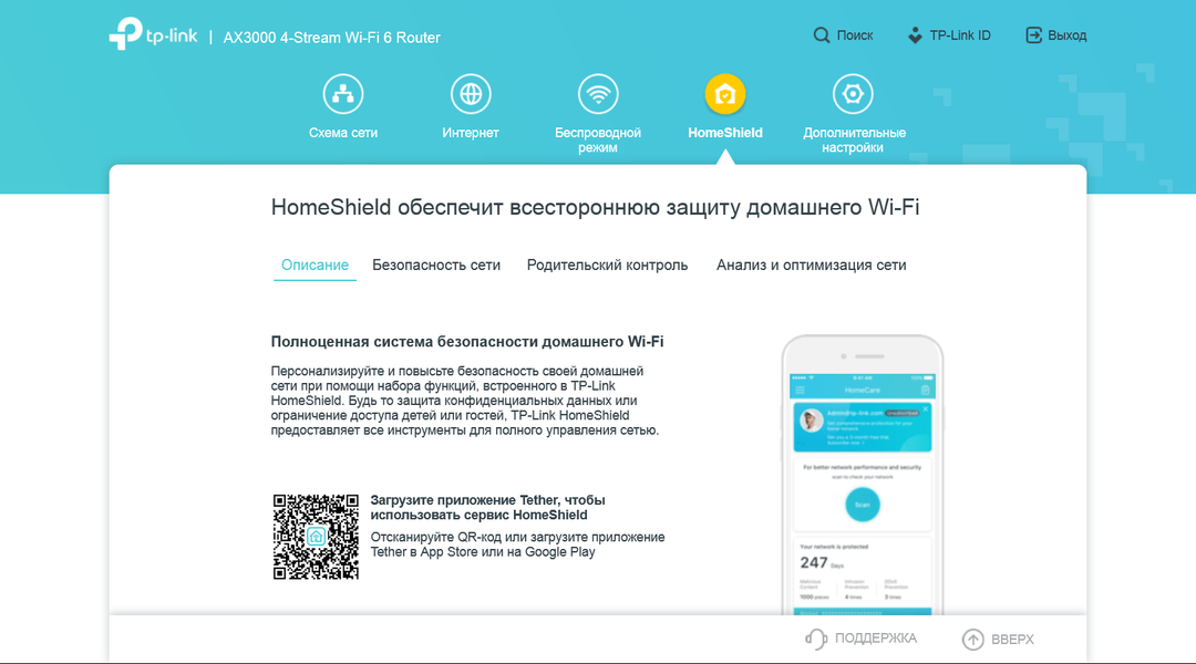 Настройки системы защиты сети HomeShield по факту осуществляются только через мобильное приложение, через браузер можно только посмотреть описание возможностей и получить ссылку на программу для смартфона.