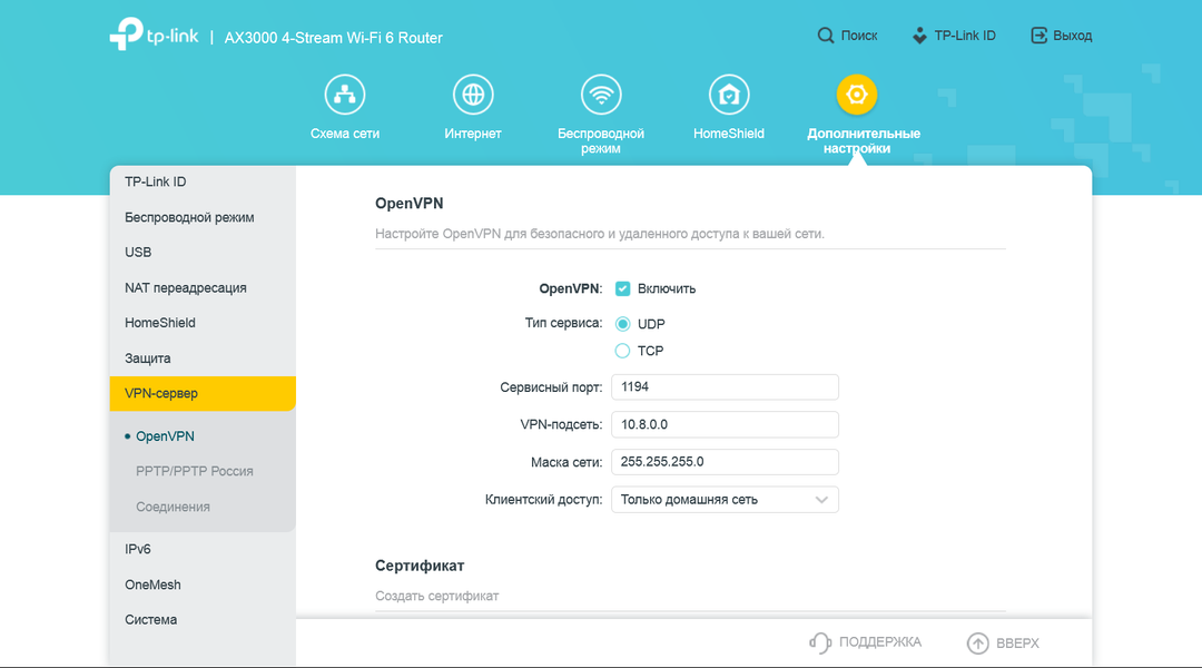 Одним из востребованных дополнительных сервисов в современных роутерах является сервер VPN. В рассматриваемом продукте он поддерживает протоколы PPTP и OpenVPN. Во втором случае можно перенаправлять весь трафик удаленного клиента через локального провайдера. Напомним, что для работы этого сервиса необходимо иметь «белый» адрес от интернет-провайдера.