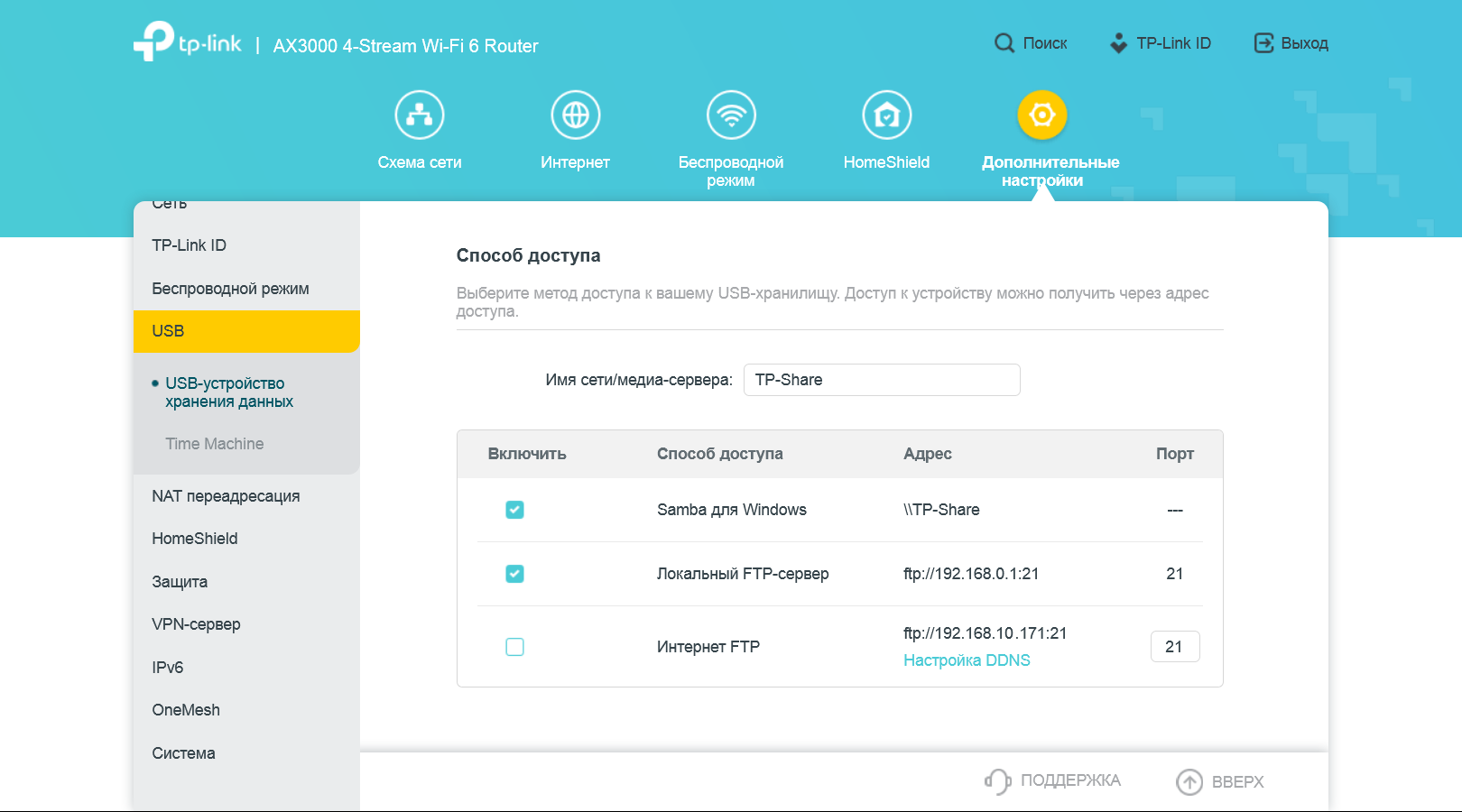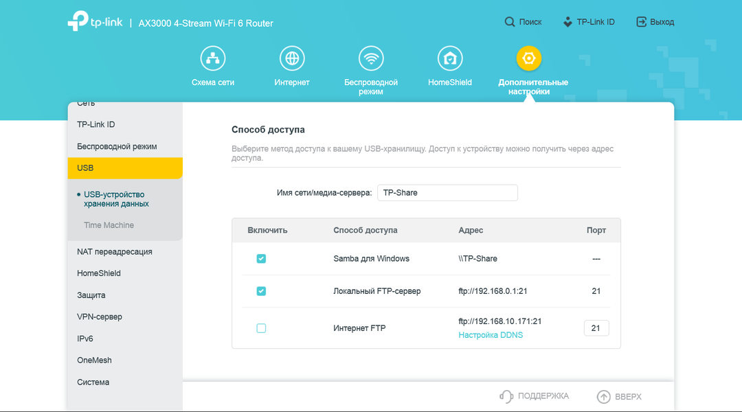 Как мы писали ранее, в роутере есть порт USB, к которому можно подключать внешние накопители. Поддерживаются файловые системы NTFS, FAT32, HFS+ и exFAT. Доступ к файлам осуществляется в локальной сети по протоколу SMB, а также можно включить работу через сервер FTP. Последний может быть доступен как локально, так и через интернет (предусмотрен пункт изменения номера порта). К сожалению, поддержки шифрования у него нет. В плане контроля прав доступа предусмотрена работа с двумя аккаунтами — с полным доступом и с доступом только на чтение. Гибкой настройки прав по папкам здесь нет. Если вы работаете только в локальной сети и нет необходимости ограничения прав — можно разрешить доступ всем без паролей.