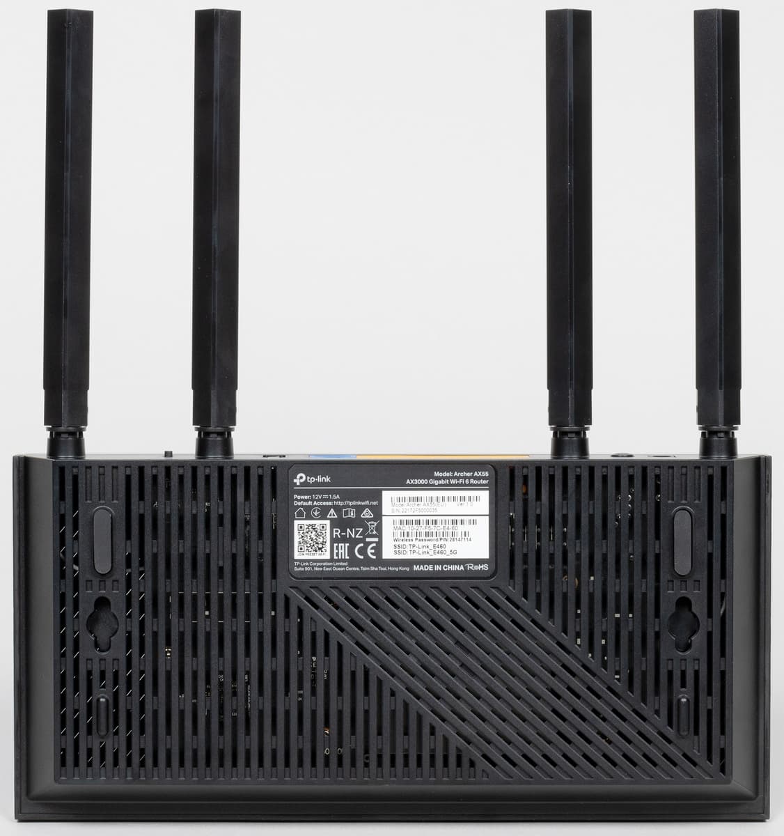 Опирается роутер на две пластиковые и две резиновые ножки. Есть возможность крепления на стену антеннами вверх или вниз. Традиционно здесь есть и наклейка с данными о продукте, включая модель, серийный номер, MAC-адрес, имена и пароли беспроводных сетей, требования к блоку питания. Все остальное пространство занимает решетка вентиляции.