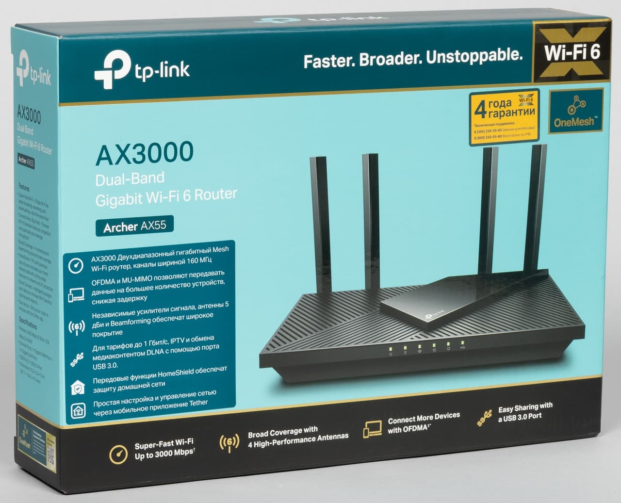 Данное устройство оборудовано гигабитными сетевыми портами, имеет один порт USB 3.0, поддерживает технологию OneMesh для простого и эффективного расширения зоны покрытия беспроводной сети, а также имеет встроенный сервис TP-Link HomeShield расширенной защиты от кибератак.