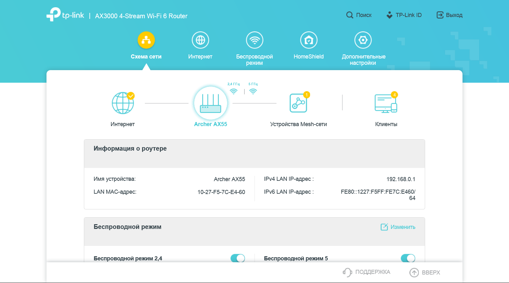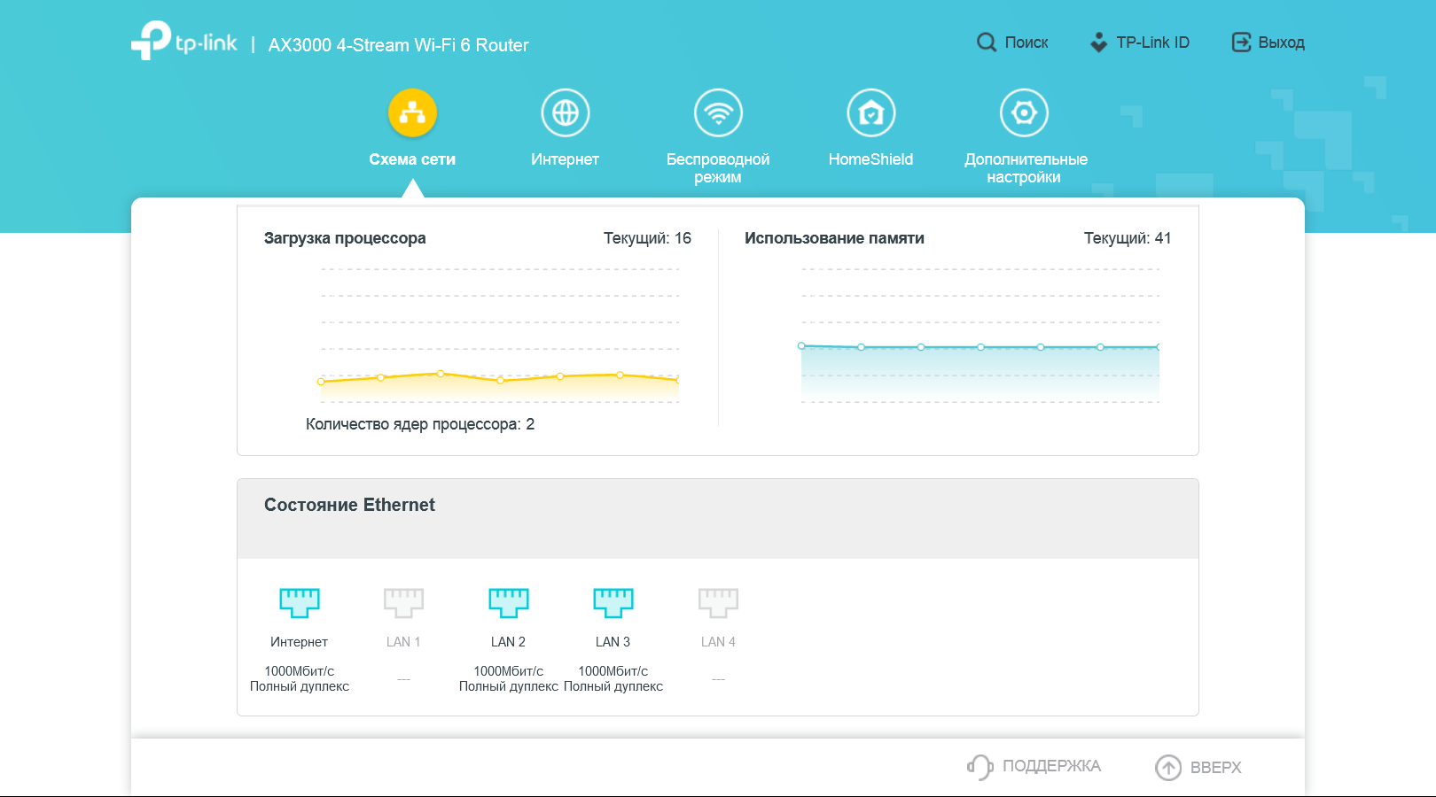 В разделе «Схема сети» собрана информация о текущем состоянии сети роутера: статус подключения к провайдеру, имена и пароли беспроводных сетей, состояние проводных портов, загрузка процессора и оперативной памяти роутера, список устройств сети Mesh, список клиентов.