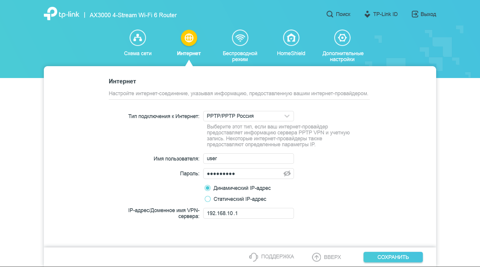 На странице «Интернет» осуществляется установка основных параметров подключения к провайдеру. Поддерживаются режимы IPoE с постоянным и динамическим адресом, PPPoE, PPTP, L2TP. Есть возможность изменить MAC-адрес порта WAN.