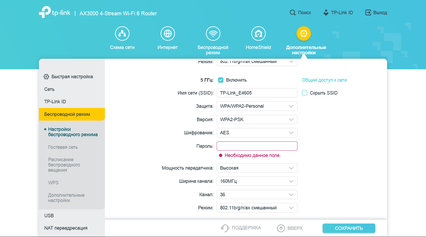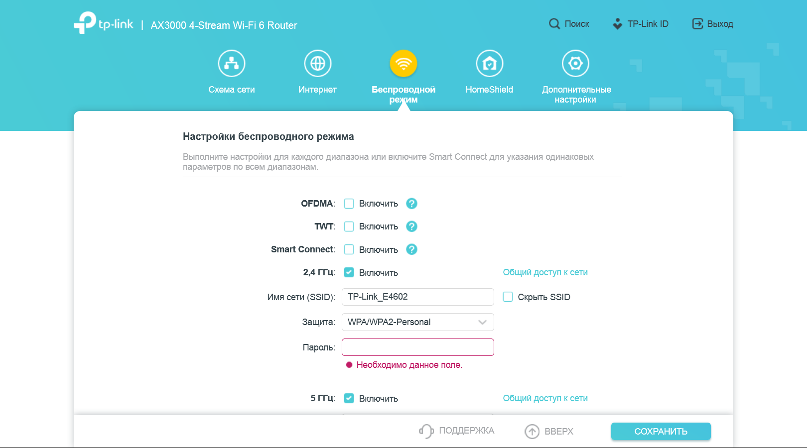 «Беспроводной режим» позволяет настроить базовые параметры беспроводных точек доступа (как основных, так и гостевых) — имена сетей, режим защиты, пароли. Предусмотрен режим «Smart Connect», в котором точки доступа в диапазонах 2,4 и 5 ГГц имеют одинаковые имена, а клиенты распределяются по ним автоматически. Здесь же мы видим пункты включения некоторых технологий Wi-Fi 6.