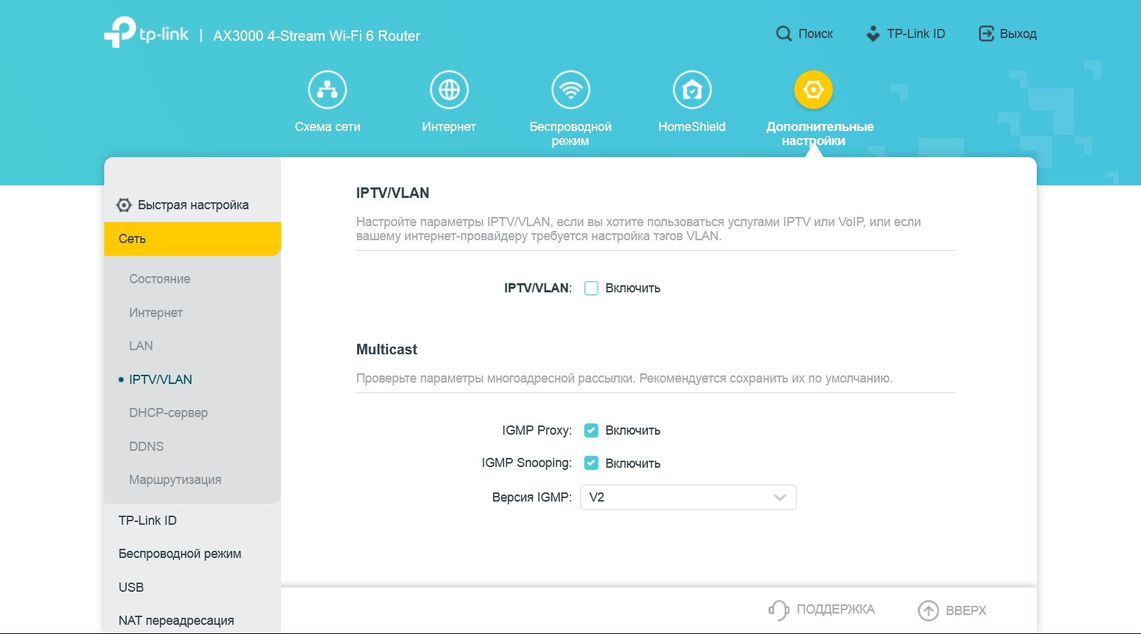 Первым пунктов в «Сеть» мы видим опции подключения к провайдеру. Причем по сравнению с ранее упомянутым пунктом «Интернет», их здесь существенно больше. В частности, речь идет об IP-адресах, MAC, MTU, сетевом имени, IPTV (поддерживаются выделение порта, мультикаст и VLAN) и так далее. Отметим, что есть поддержка протокола IPv6, настройки которого выделены в отдельный пункт меню.
