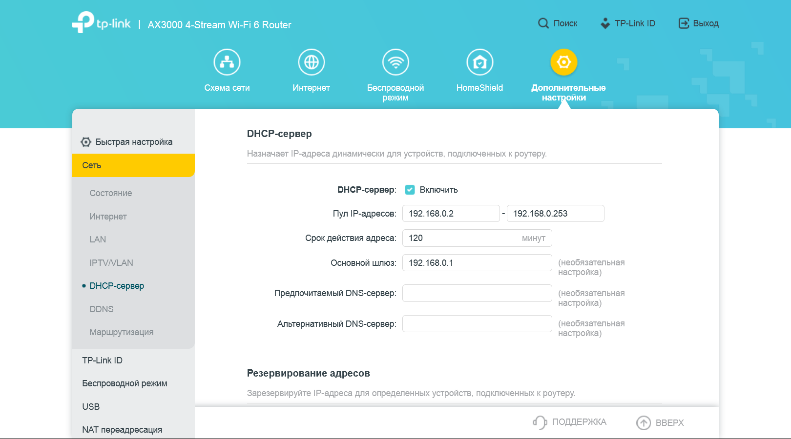 В настройках сегмента локальной сети как обычно есть возможность установить собственный адрес роутера, указать диапазон адресов для выдачи клиентам сервером DHCP, зарезервировать для них фиксированные адреса.