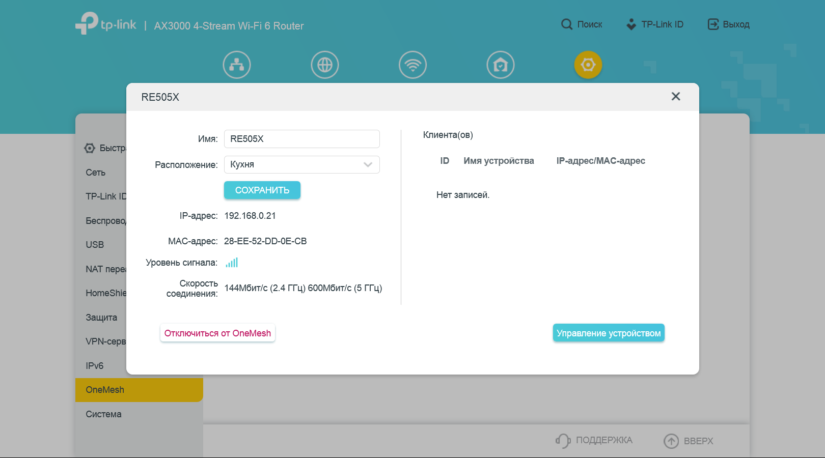 Роутер имеет поддержку технологии OneMesh для расширения зоны покрытия беспроводной сети путем подключения дополнительных повторителей. Каких-то специальных настроек для нее не предусмотрено. Можно только посмотреть список узлов сети и узнать, какие клиенты к ним подключены.