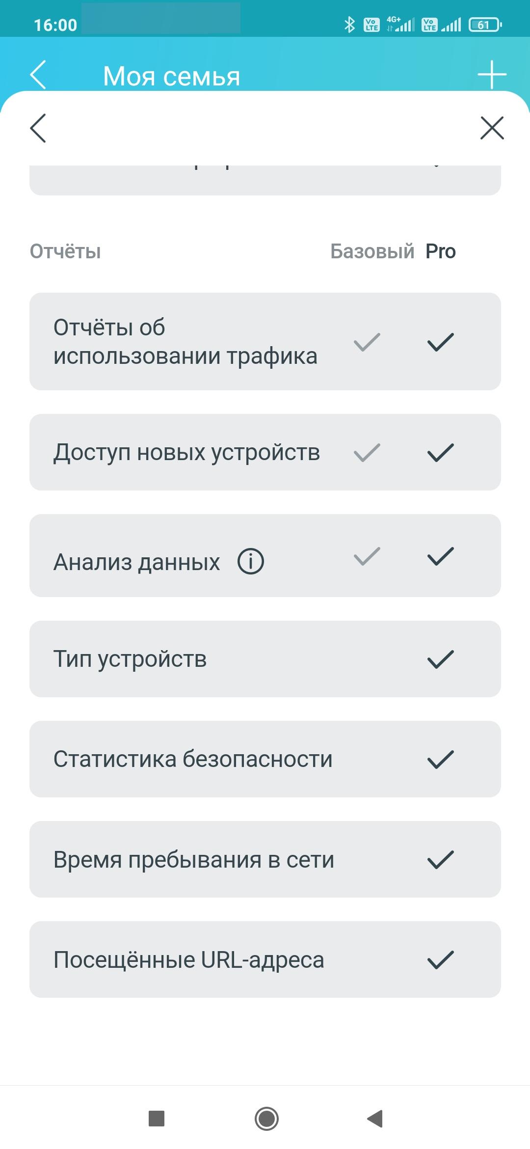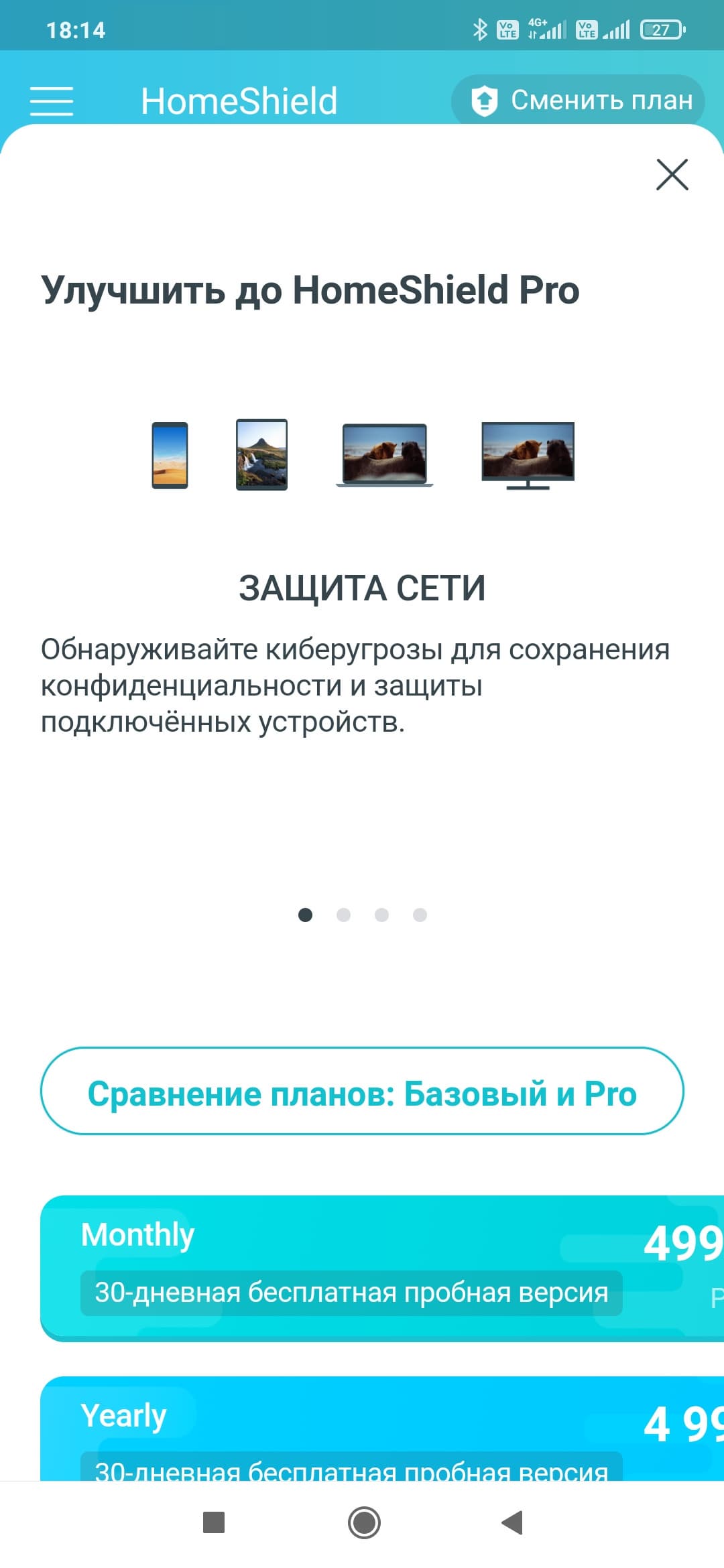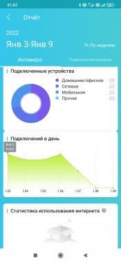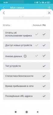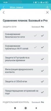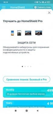 При переходе на соответствующую страницу нас встречает баннер с предложением попробовать HomeShield Pro. Это отдельная платная (499 рублей в месяц или 4999 рублей в год) подписка с расширенным набором возможностей. На странице сайта с описанием сервиса мы узнаём, что на самом деле в бесплатной версии доступно не так уж много всего из заявленного. В частности, для IoT есть только обнаружение, но не защита, отсутствует фильтр контента, подробные отчеты по трафику есть только за один день, нет анализа времени в сети и посещения сайтов и так далее. Посмотрим, что же осталось полезного в дюжине пунктов, хотя, конечно, не все из них понятны с точки зрения формулировки.