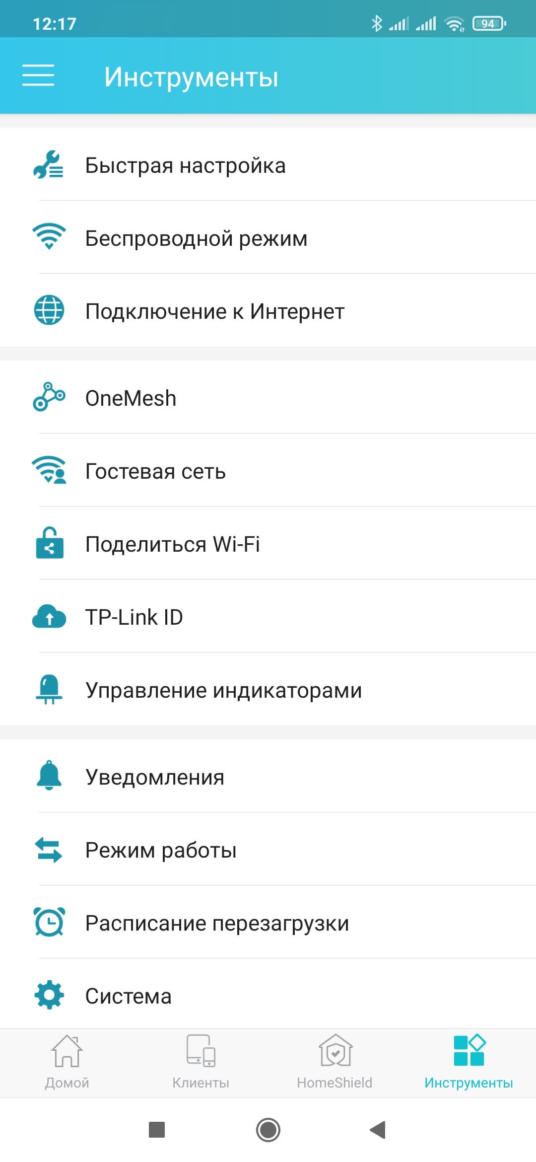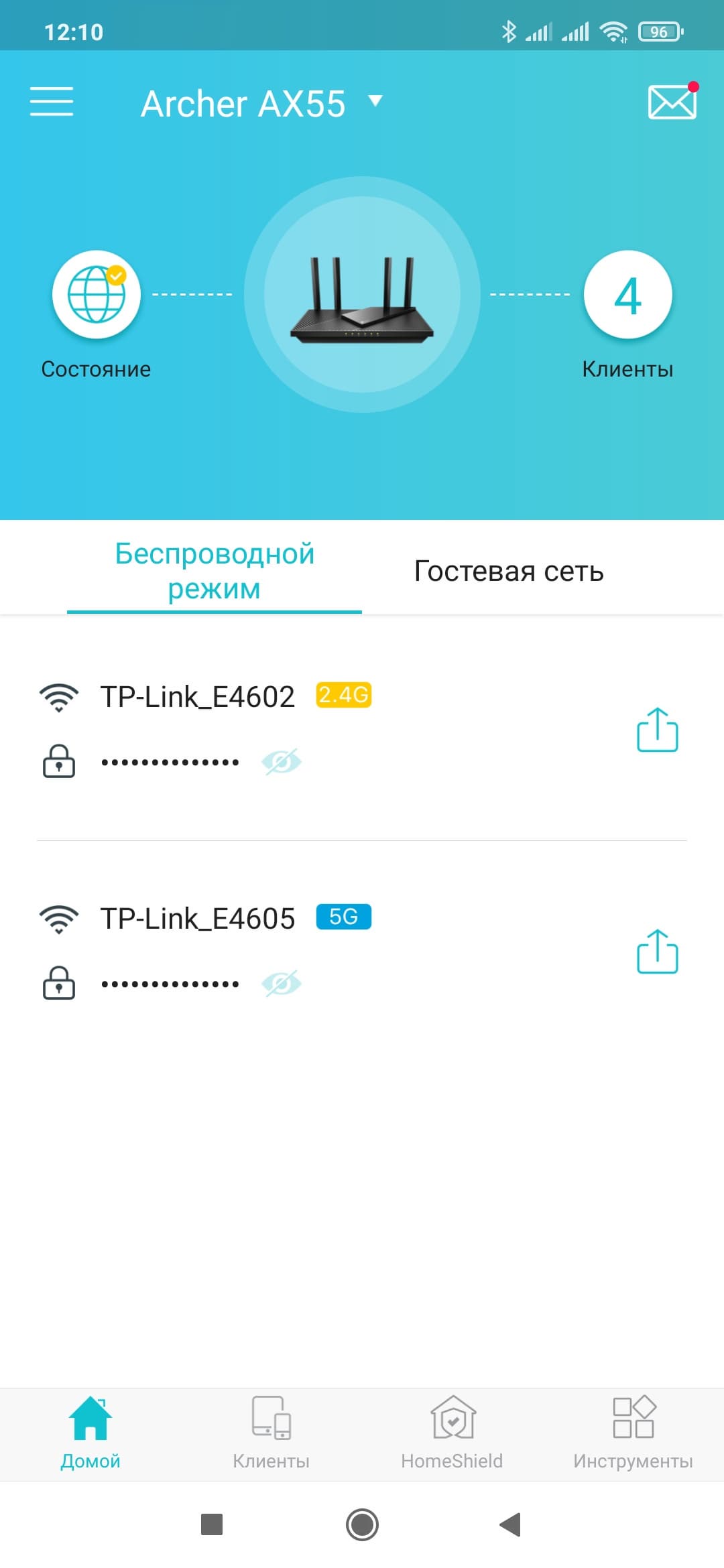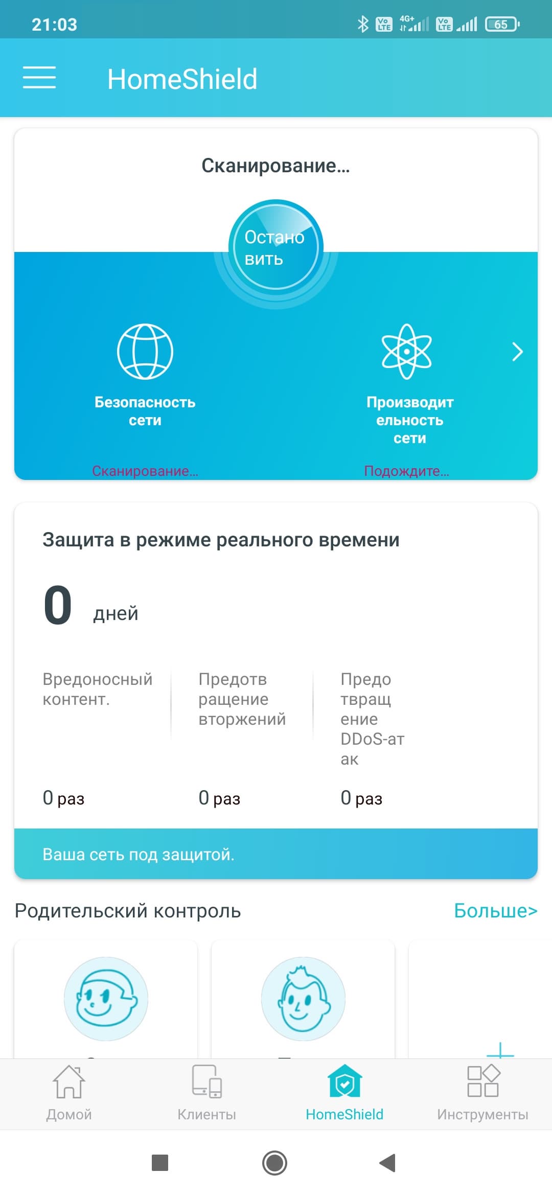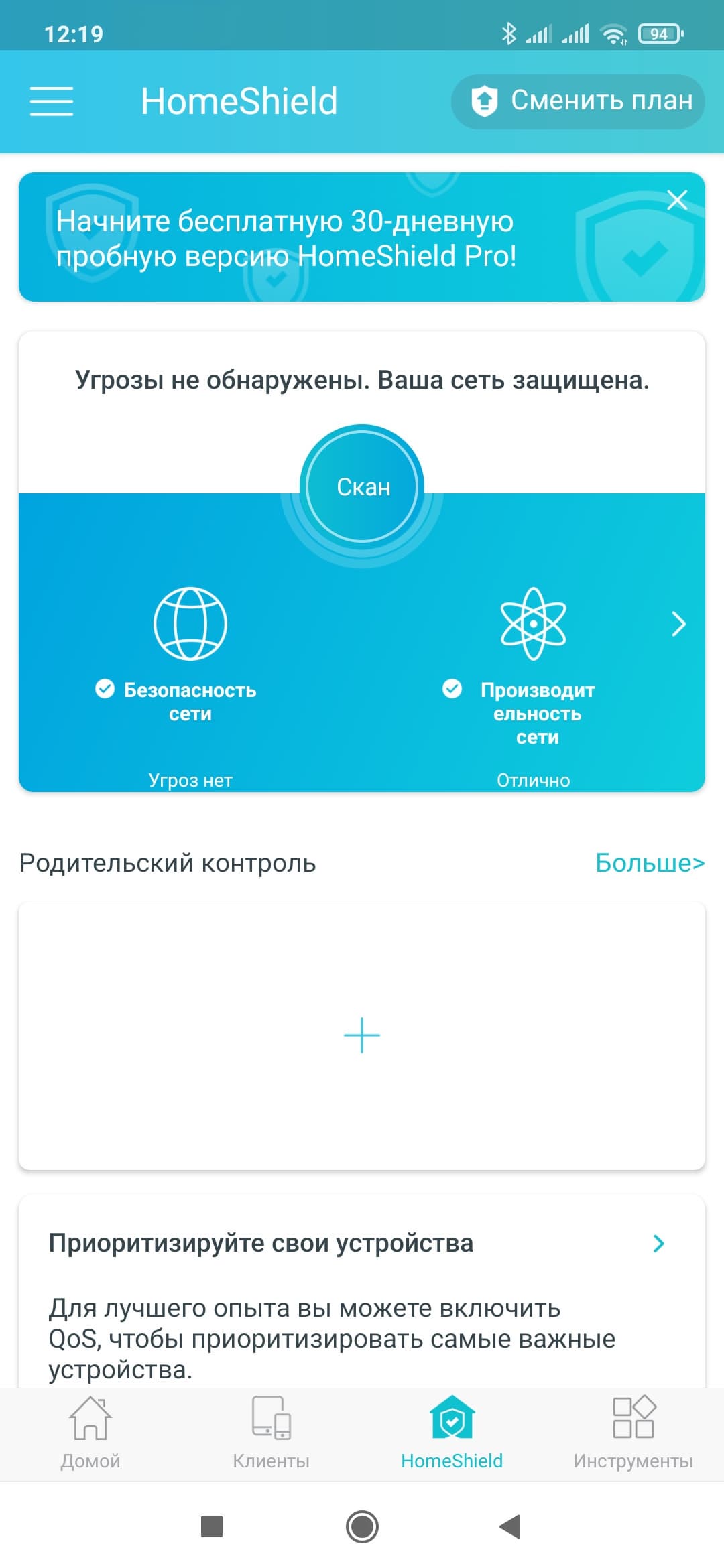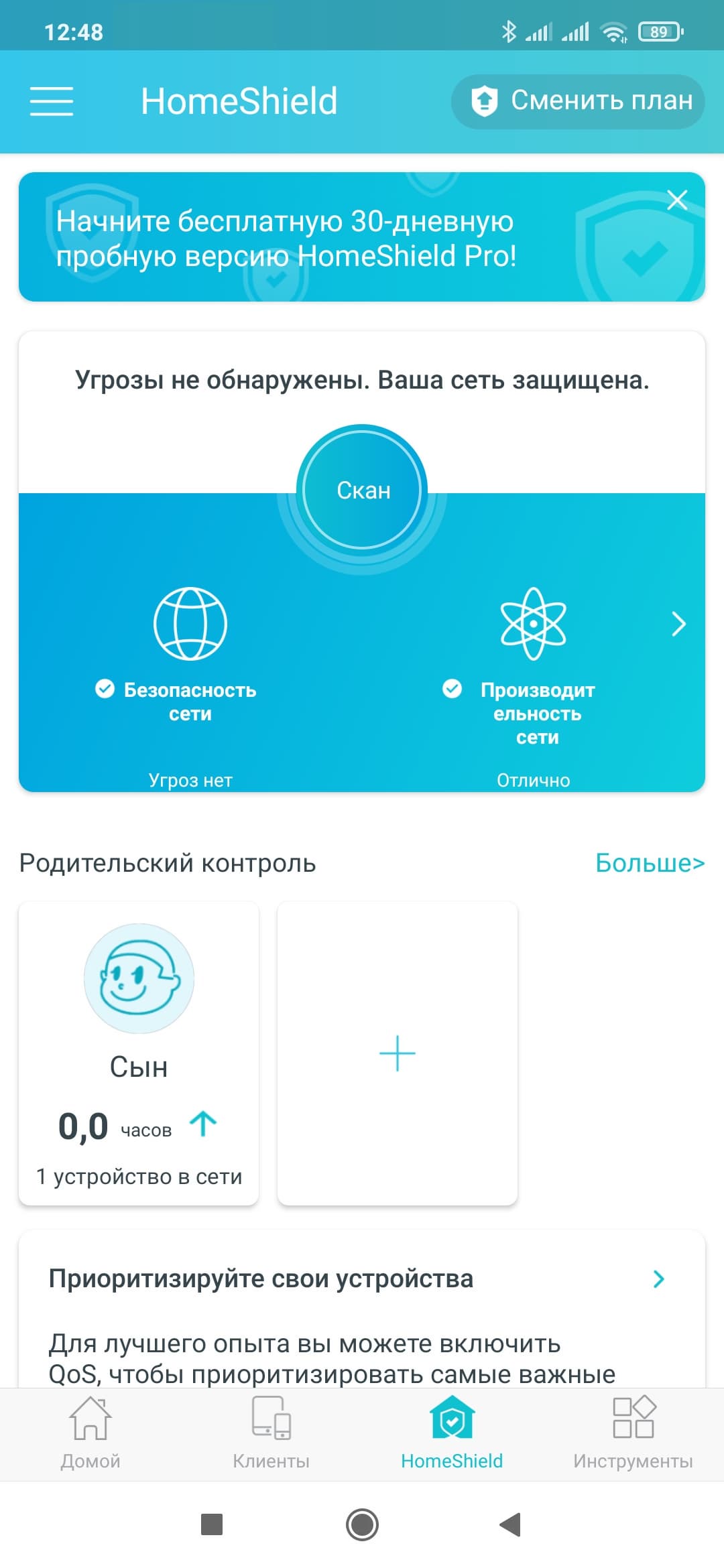 После запуска программы выбираем нужный роутер (их на одном аккаунте может быть сразу несколько). На домашнем экране мы видим аналогичную веб-интерфейсу интерактивную схему сети. На странице «Клиенты» можно увидеть их список, по клику на каждом — узнать подробности, настроить приоритет, заблокировать доступ к сети. На странице «Инструменты» собраны базовые настройки роутера, которые мы описывали выше — подключение к интернету, беспроводные точки доступа, гостевая сеть и так далее. Нас же в данном случае интересует функция HomeShield.