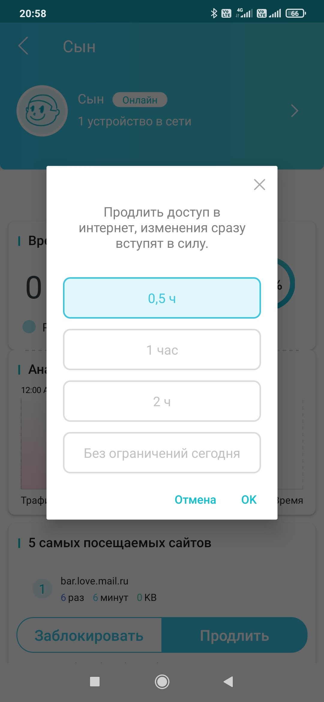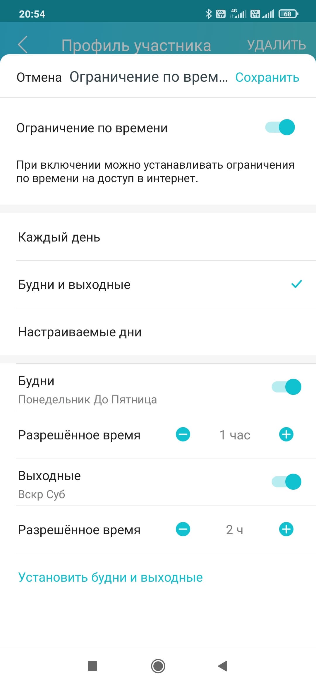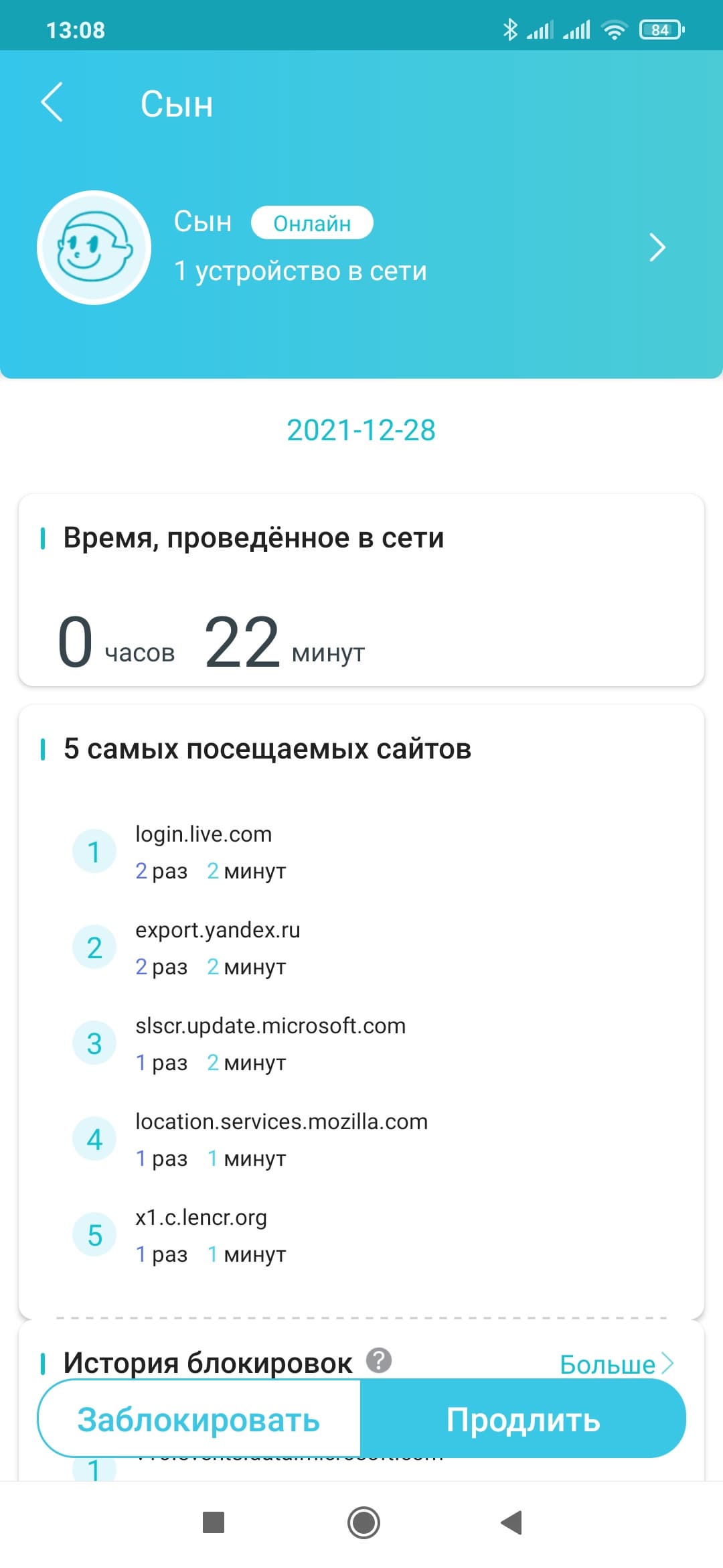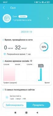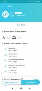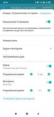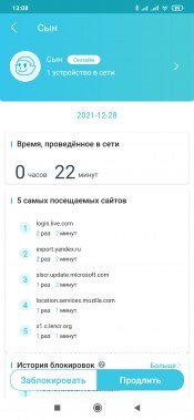 В родительском контроле появилась возможность установки ограничения на проводимое в сети время. Для этого в настройках профиля указывается длительность с точностью до получаса на все дни, значения на будни и выходные или на каждый день недели индивидуально. Функция действительно очень интересная, хотя не очень понятно, как конкретно она работает. Не секрет, что современные ОС и приложения практически не прекращают обмениваться информацией с серверами в интернете. В этом смысле единственным вариантом точно не работать с сетью является выключение устройства. Если на текущий день лимит был израсходован (или даже до его окончания) можно добавить в ручном режиме полчаса, час, два или совсем отключить ограничение на сегодня. Предусмотрена и возможность заблокировать доступ в любой момент. Но уменьшить текущий лимит «на лету» нельзя.