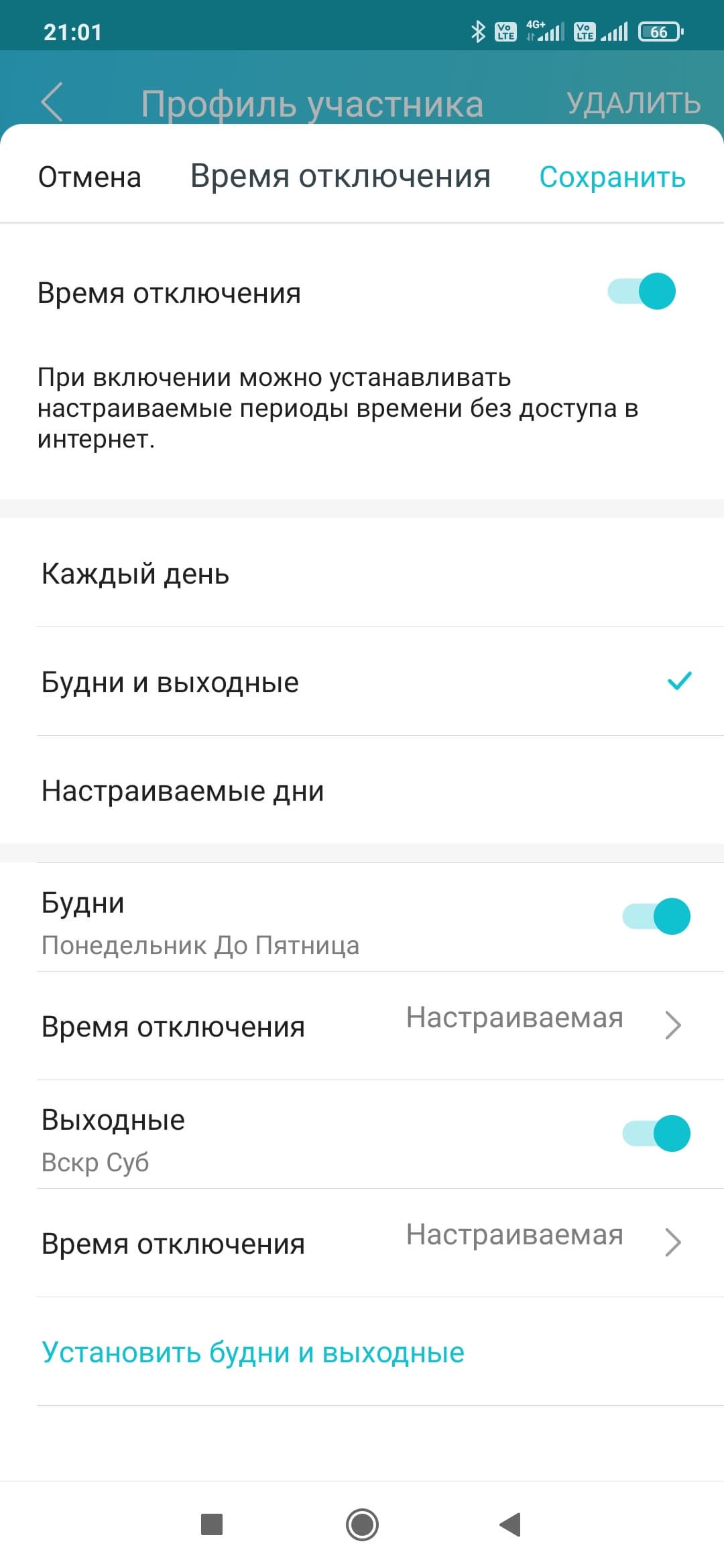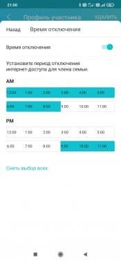 Вторая «открытая» в версии Pro функция — установка расписания доступа к интернету. Здесь тоже есть деление «на все дни», «на будни и выходные» и «индивидуально на каждый день недели». Далее указывается время с точностью до получаса, когда устройства профиля не будут иметь доступа к интернету.