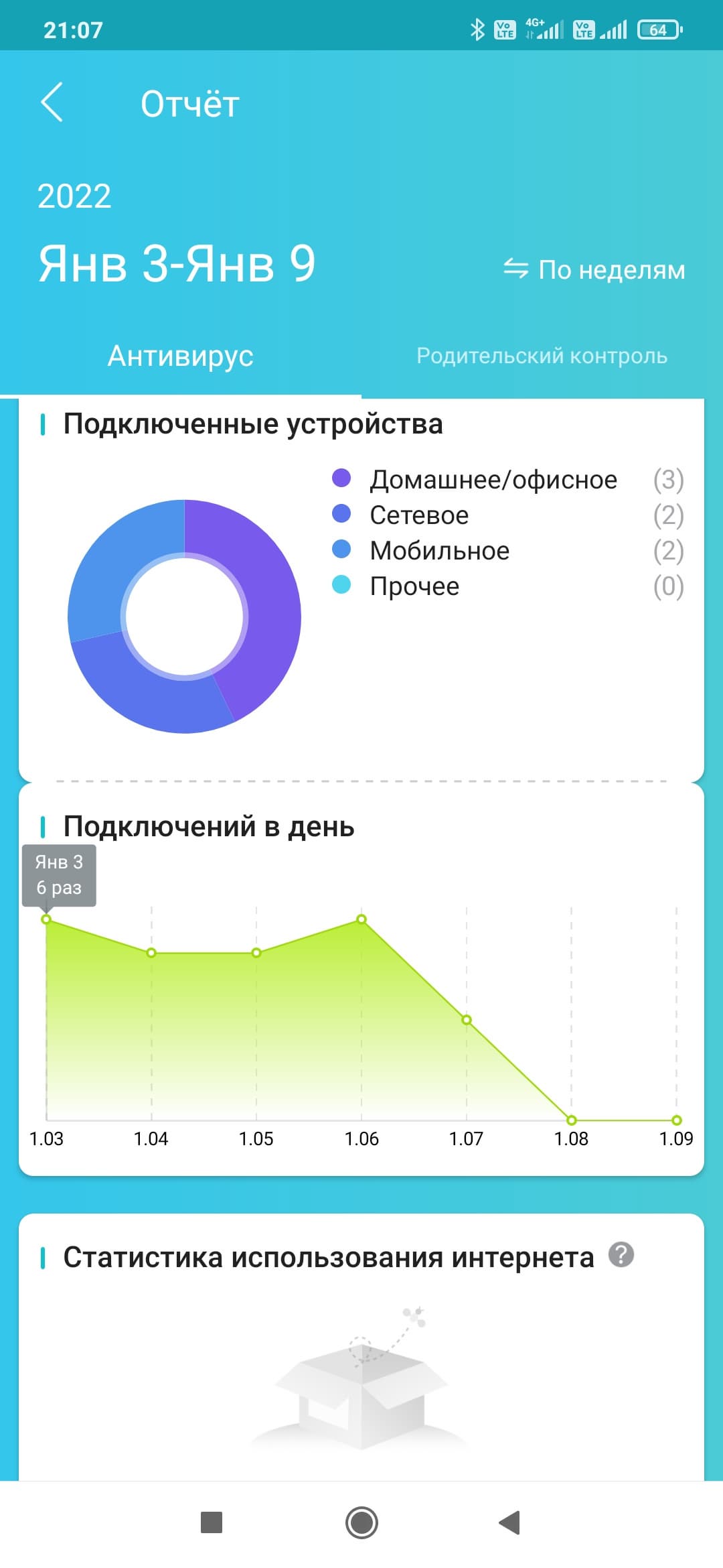 Последняя заявленная функция — отчеты по трафику. В базовой версии тарифа здесь все сильно ограничено. Вы можете видеть график числа подключенных к роутеру клиентов за неделю, а для анализа трафика работает, вероятно, только для клиентов, которым назначен какой-то профиль из «Родительского контроля».
