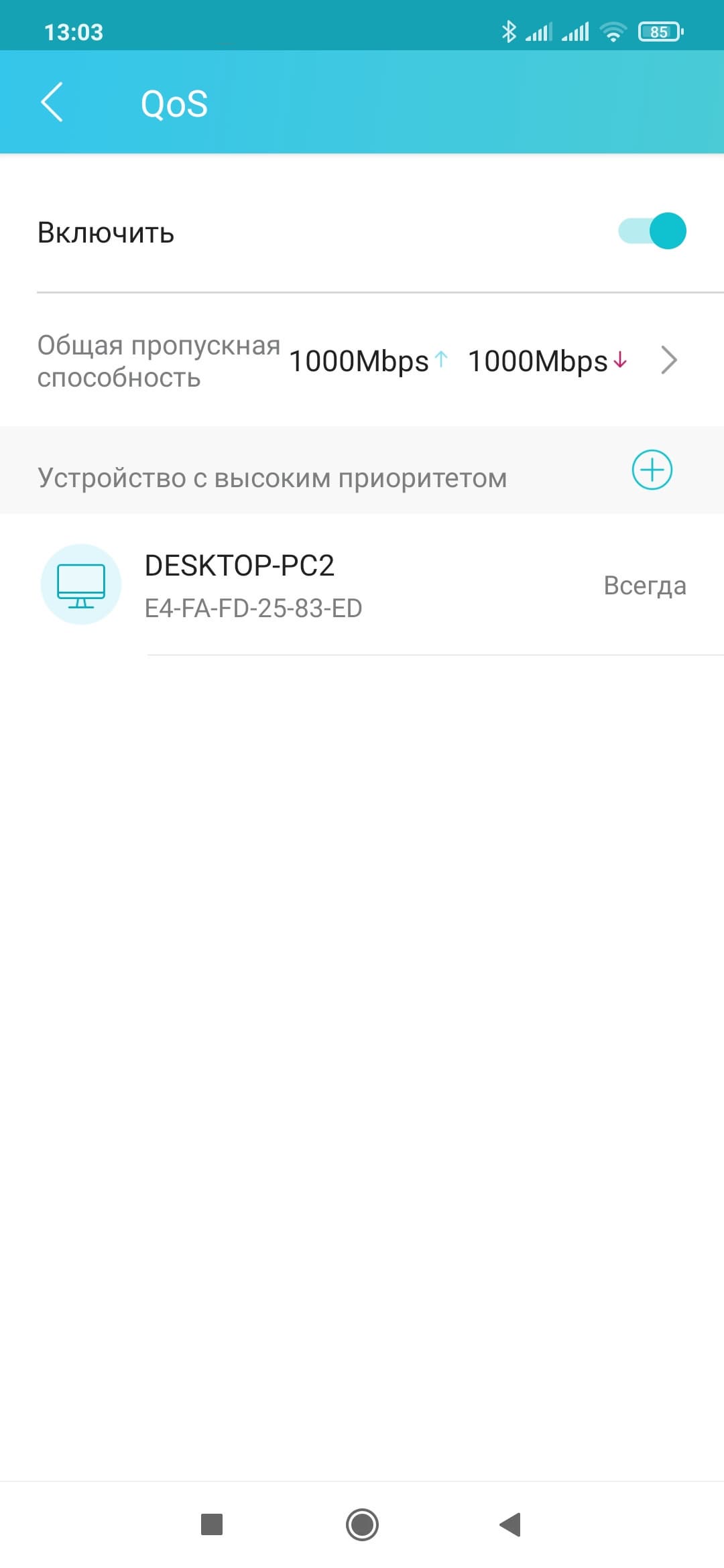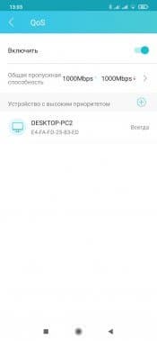 Следующий сервис — управление полосой пропускания (QoS). По гибкости здесь все тоже не очень интересно — включаем функцию, указываем скорости подключения к интернету, добавляем клиентов в список приоритетных.
