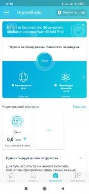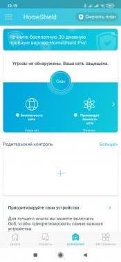 В целом, набор возможностей встроенного программного обеспечения роутера можно оценить как вполне обычный для данного сегмента. Но заглянем еще в мобильное приложение и посмотрим, что может предложить функция HomeShield. В веб-интерфейсе для нее были отмечены следующие возможности: анализ и оптимизация сети, защита устройств IoT, система предотвращения вторжений, фильтр вредоносного контента, ограничение на проводимое в сети время, приоритизация трафика, отчеты по трафику.