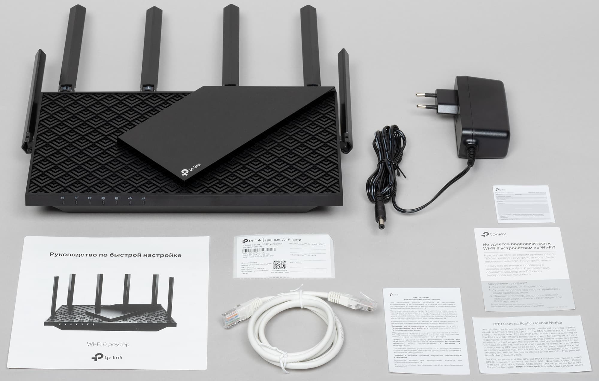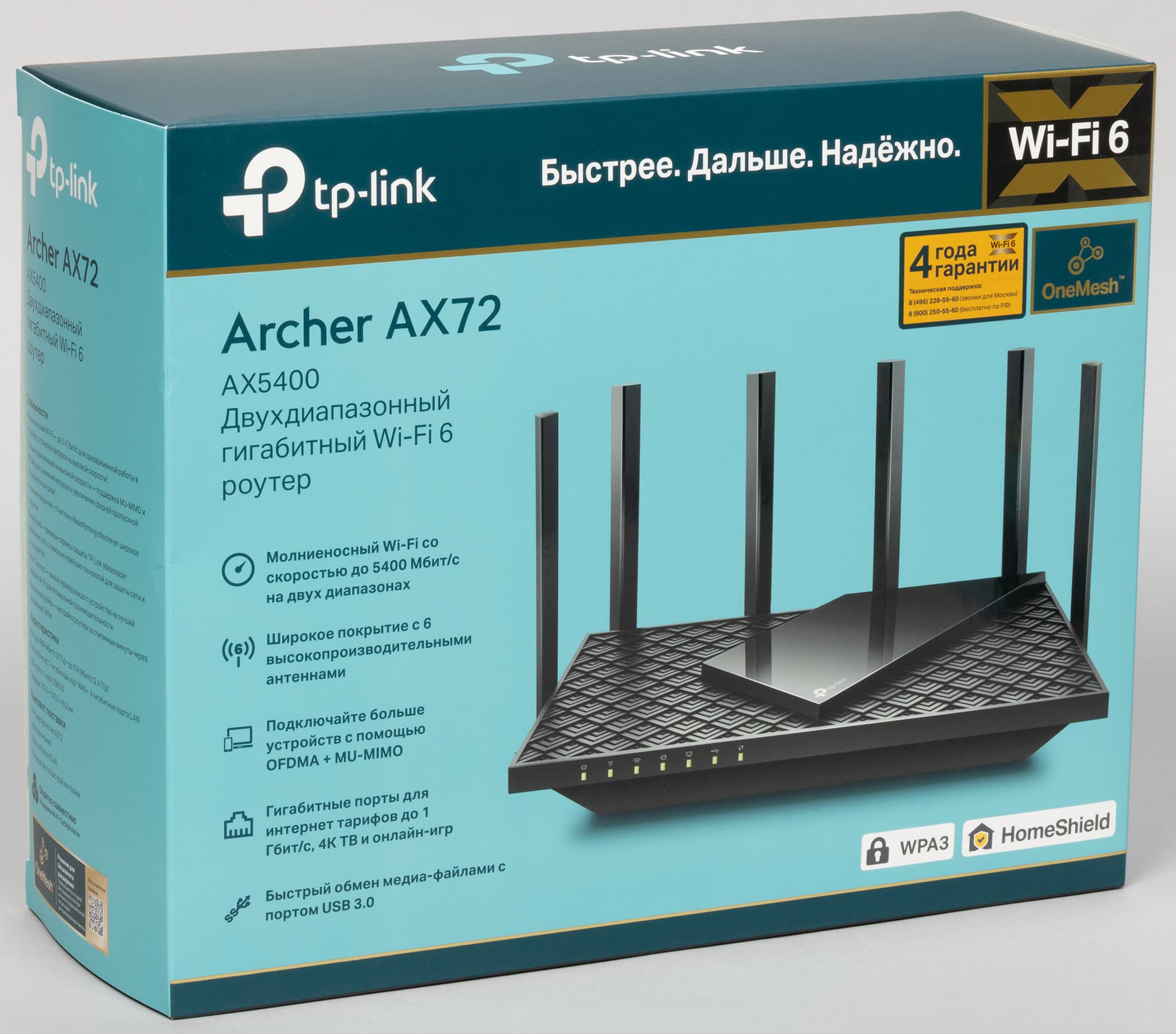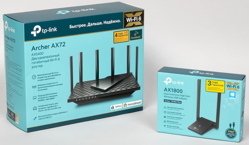 Роутер TP-Link Archer AX72 и беспроводной USB-адаптер TP-Link Archer TX20U Plus поставляются в упаковках отличного полиграфического исполнения, которое наследует основные черты фирменного стиля производителя.