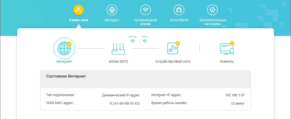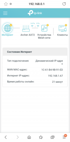 Для доступа к интернету мы используем подключение к гигабитной оптической сети (GPON) посредством абонентского терминала провайдера, протокол динамической конфигурации которого (DHCP) управляет назначением адресов подключенных клиентов. Наше устройство получило IP-адрес 192.168.1.67 в подсети роутера провайдера, который, по счастью, не менялся в других сессиях. Клик мышью на пиктограмме, подписанной «Archer AX72», выводит базовую информацию о текущем состоянии прибора.