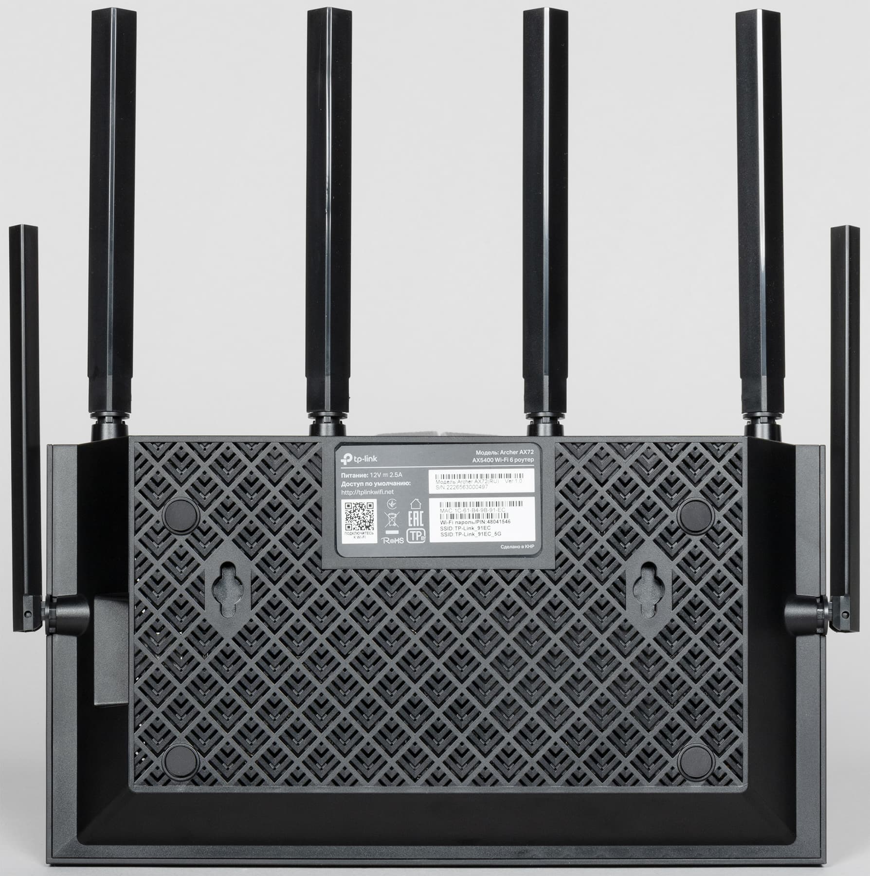 На правой и левой боковых панелях установлены две антенны, форма и размеры которых идентичны тем, которыми оснащен роутер TP-Link Archer AX72, об устройстве которого мы рассказывали в начале материала.