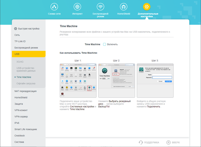 Для пользователей устройств марки Apple будет полезной поддержка фирменного сервиса резервного копирования Time Machine, который задействует внешний USB-накопитель.