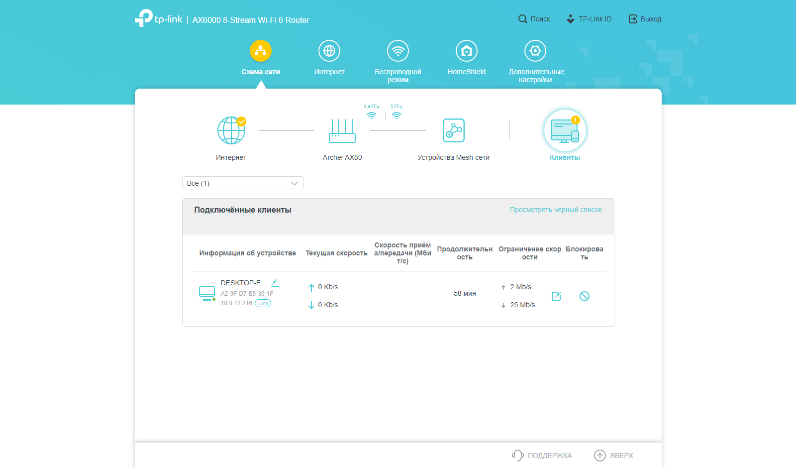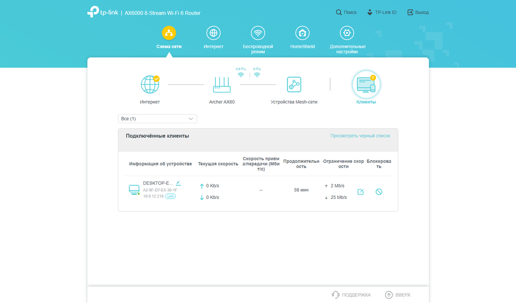 В верхнем уровне меню пять пунктов. Первый, Network Map, поможет определить текущее состояние устройства и сети. Из интересного и полезного отметим отображение статуса проводных портов, нагрузки на процессор и оперативную память, параметры работы Wi-Fi, оперативную блокировку клиентов и ограничение их скорости, информацию об узлах Mesh-сети.