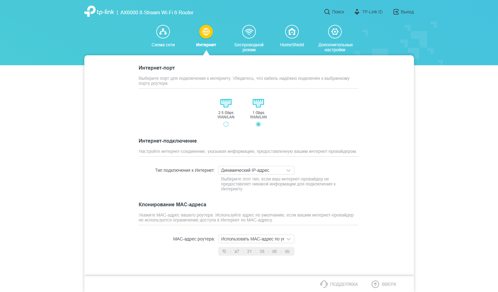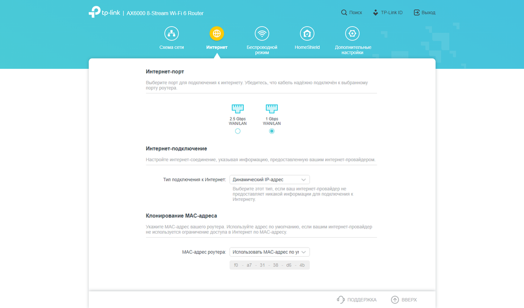 На странице Internet выбирается порт для кабеля провайдера, собственно режим подключения (постоянный или динамический адрес, а также клиент PPPoE, PPTP или L2TP). Есть возможность смены MAC-адреса на порту WAN.